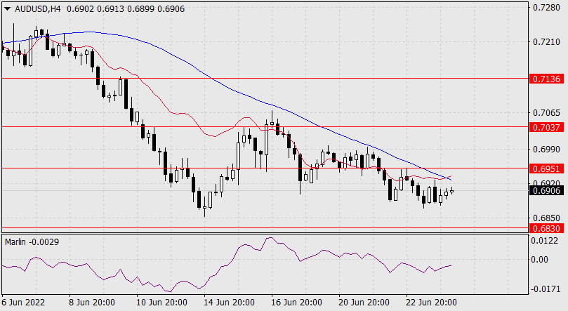 Прогноз по AUD/USD на 24 июня 2022 годаИнстаФорекс - Instaforex, 3 года назад Вчерашний день австралийский доллар закрыл понижением на 33 пункта. На дневном масштабе цена закрепилась под уровнем 0.6951, теперь она продвигается к цели 0.6830 – к минимуму 12 мая. Осциллятор Марлин снижается в отрицательной области, тенденция понижающаяся. Вторая цель 0.6755.
