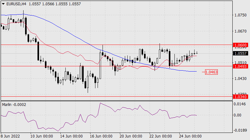Прогноз по EUR/USD на 27 июня 2022 годаИнстаФорекс - Instaforex, 3 года назад В прошедшую пятницу евро подрос на 35 пунктов, рост был ограничен сопротивлением совпадений индикаторных линий баланса и Крузенштерна дневного масштаба. Сегодня утром сигнальная линия осциллятора Марлин во второй раз показывает намерение развернуться вниз от нулевой линии.