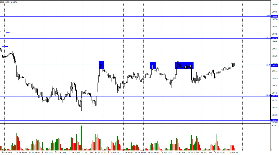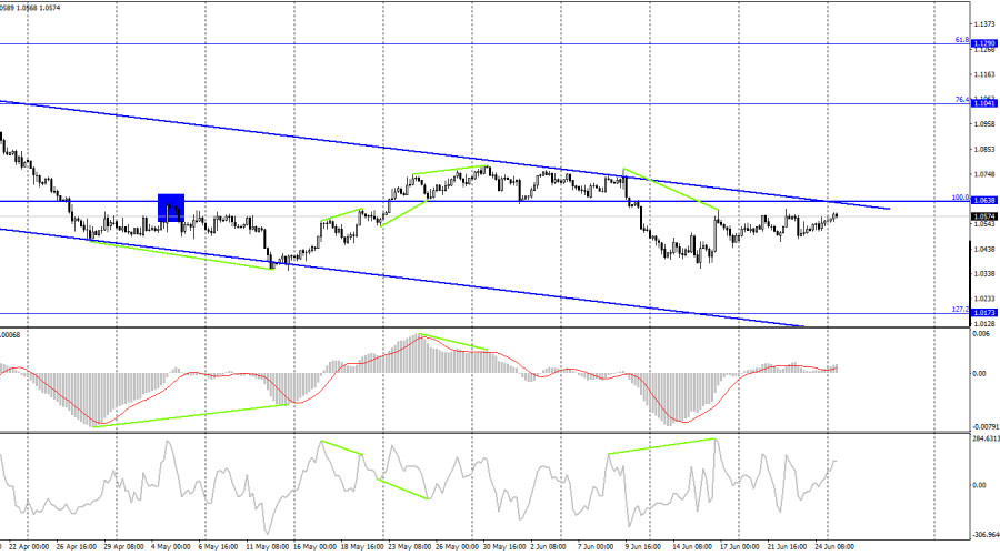 EUR/USD. 27 июня. Неделя новая, проблемы старыеИнстаФорекс - Instaforex, 3 года назад Добрый день, уважаемые трейдеры! Пара EUR/USD в пятницу выполнила новый возврат к уровню коррекции 161,8% - 1,0574. На этот раз отбоя от этого уровня не случилось, однако и закрытия над ним тоже не произошло. В понедельник котировки европейской валюты закрылись немного выше указанного уровня, но я не могу считать 15 пунктов «закрытием над уровнем». Таким образом, сохраняется вероятность отбой от уровня 1,0574 с новым падением в направлении уровня Фибо 200,0% - 1,0430, до которого пара, вероятно, опять не сумеет добраться. Началась новая неделя, а движения пары евро-доллар остались прежними. Следует отметить, что начало у новой недели чрезвычайно скучное. Информационный фон практически отсутствует, хотя в середине и конце недели будет несколько важных событий. Ну а пока их нет, я предлагаю еще раз попытаться разобраться в том, есть ли какие-то перспективы роста у евро в ближайшее время. Напомню, что практически все трейдеры и аналитики сейчас на 90% сосредоточили свое внимание вокруг действий ФРС и ЕЦБ. И здесь все далеко не в пользу евро. ФРС на прошлом заседании повысила ставку на 0,75% и, вероятнее всего, повторит этот шаг и на следующем заседании, которое состоится в следующем месяце. Таким образом, приверженность ФРС «ястребиному» подходу не вызывает никаких сомнений. А доллар США чувствует это и не позволяет евровалюте показать сильный рост. С другой стороны, у нас ЕЦБ, который может быть в следующем месяце повысит свою процентную ставку в первый раз. Я считаю, что повышение будет не больше, чем на 0,25%. Если так все и будет, то у евровалюты и в следующем месяце не будет ни одного основания для того, чтобы показать рост. До того дня, когда пройдет первое следующее заседание центрального банка, евро может расти, но делать это, вероятнее всего, будет в том же темпе, что и на прошлой неделе. Таким образом, я считаю, что небольшие шансы на рост пары есть, но вряд ли мы увидим сильный рост. Если котировки выполнят уверенное закрытие над уровнем 1,0574, тогда можно будет ожидать движения в направлении 1,0705. На 4-часовом графике пара возобновила процесс движения в направлении верхней линии нисходящего трендового коридора, который по-прежнему характеризует настроение трейдеров, как «медвежье». Я намеренно называю это движение «движением», а не «ростом», так как на рост оно очень слабо похоже. Закрепление курса пары над коридором значительно повысит вероятность дальнейшего роста европейской валюты в направлении уровня Фибо 76,4% - 1,1041. Отчет Commitments of Traders (COT):