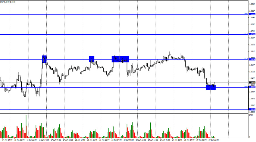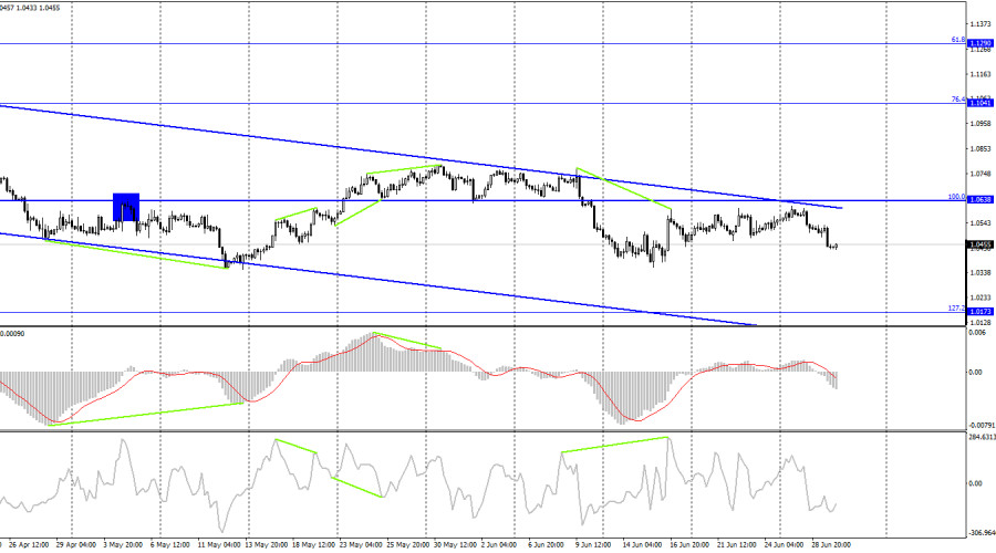 EUR/USD. 30 июня. Кристин Лагард: мировая экономика не вернется к низкой инфляцииИнстаФорекс - Instaforex, 3 года назад Добрый день, уважаемые трейдеры! Пара EUR/USD в среду продолжала процесс падения и отработала уровень коррекции 200,0% - 1,0430. Отбой котировок от этого уровня сработает в пользу европейской валюты и некоторого роста в направлении уровня Фибо 161,8% - 1,0574. Закрепление курса пары под уровнем 1,0430 повысит вероятность дальнейшего падения в направлении следующего уровня 1,0315. В течение последних двух недель трейдеры-быки штурмовали уровень 1,0430. Несколько раз они даже сумели выполнить закрытие над ним, однако, возможно, более сильный и реальный уровень проходил буквально на 10-20 пунктов выше, так как пара каждый раз выполняла разворот в пользу доллара. Я склонен считать, что быкам не удалось реализовать свои надежды, а сейчас европейская валюта довольно легко, практически за сутки, упала на 150 пунктов. Если надолго она не задержится около 1,0430, то может продолжить падение к минимумам 2022 года. Вчерашний день был достаточно насыщенным. ВВП США, выступления Лагард и Пауэлла - эти события могли помочь трейдерам торговать более активно. Однако имел ли причины для роста американский доллар или же трейдерам просто надоело пытаться прорваться сквозь уровень 1,0574? С моей точки зрения, второй вариант более верен. ВВП в США в первом квартале оказался еще хуже, чем предыдущая, тоже очень низкая оценка, -1,6% по отношению к предыдущему кварталу. Таким образом, доллар не мог показать рост при падении американской экономики. Выступление Джерома Пауэлла не отличалось новизной, так как все основные свои мысли президент ФРС просто повторил уже в очередной раз. Кристин Лагард говорила об инфляции (о чем же еще сейчас говорить?) и о том, что мировая экономика уже вряд ли вернется во времена низкого инфляционного давления. Президент ЕЦБ считает, что за последние несколько лет слишком многое изменилось, поэтому даже если инфляцию удастся со временем понизить, она все равно будет оставаться гораздо выше тех уровней, которые наблюдались до пандемии. На 4-часовом графике пара выполнила разворот в пользу доллара США и начала новый процесс падения в направлении уровня коррекции 127,2% - 1,0173. Закрепление курса пары над коридором позволит трейдерам рассчитывать на возобновление роста европейской валюты в направлении уровня Фибо 76,4% - 1,1041. Назревающих дивергенций сегодня не наблюдается ни у одного индикатора. Отчет Commitments of Traders (COT):