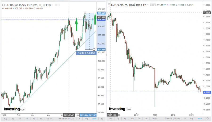 EUR/CHF: в устойчивом нисходящем тренде. Продавать?ИнстаФорекс - Instaforex, 3 года назад Сегодня, в последний день месяца, квартала и полугодия доллар сохраняет позитивную динамику, в то время как его индекс DXY остаётся вблизи отметки 105.00. На момент публикации данной статьи фьючерсы DXY торгуются вблизи отметки 104.81. Пробой недавнего локального максимума 105.56 станет сигналом для наращивания длинных позиций по фьючерсам DXY с перспективой роста в сторону многолетних максимумов 121.29 и 129.05, достигнутых, соответственно, в июне 2001 года и в ноябре 1985 года. Между тем основной конкурент доллара на валютном рынке евро снижается с открытия сегодняшнего торгового дня как против доллара, так и в основных кросс-парах. Исключение здесь, пожалуй, составляет лишь пара EUR/CHF. Если не считать ее падения в предыдущие 3 недели, то сегодня пара остановила свое падение и даже немного выросла с открытия сегодняшнего торгового дня. В 2014 году Национальный Банк Швейцарии впервые с 1970 года ввёл отрицательную ставку по депозитам. В то же время с сентября 2012 года НБШ стремился поддерживать курс EURCHF на уровне 1.2000 с целью сдерживания «чрезмерного» укрепления швейцарского франка и ослабления давления на экспортеров страны. И до 2015 года ему это более-менее удавалось. Однако с ростом рисков и по мере удешевления евро падение EUR/CHF с мая 2018 года перешло в устойчивый нисходящий тренд, а, после того как в середине этого месяца (16 июня) Швейцарский национальный банк неожиданно повысил процентную ставку по депозитам до -0,25%, удивив инвесторов и экономистов, ожидавших, что процентная ставка останется на прежнем уровне -0,75%, пара EUR/CHF и вовсе резко снизилась, достигнув вчера нового локального минимума с февраля 2015 года на отметке 0.9963. Напомним, что в январе 2015 года НБШ решил отказаться от привязки курса франка к евро, отойдя также от целевого уровня 1.2000 в котировках EUR/CHF. В тот день (15 января 2015 года) котировки EUR/CHF рухнули более чем на 20%, а в конце января 2015 года EUR/CHF торговалась уже вблизи отметки 1.0500. После решения в июне этого года Швейцарского национального банка повысить учетную ставку на 50 базисных пунктов, его глава Томас Джордан отметил, что швейцарский франк больше не является сильно переоцененным из-за недавнего снижения (см. также наш обзор за 17.06.2022 «USD/CHF: НБ Швейцарии удивил инвесторов. Что дальше?»). Франк резко укрепился после этого решения НБШ, а пара EUR/CHF упала в моменте на 2,47%, до локального внутридневного минимума 1.0130. В текущий момент в динамике EUR/CHF (об особенностях торговли этой валютной парой также см. EUR/CHF: валютная пара (характеристики, рекомендации)) преобладает медвежий импульс. Поэтому ее сегодняшний рост, вероятно, стоит рассмотреть как возможность войти в новые короткие позиции (подробнее см. в «EUR/CHF: технический анализ и торговые рекомендации на 30.06.2022»). Материал предоставлен компанией InstaForex - www.instaforex.com |