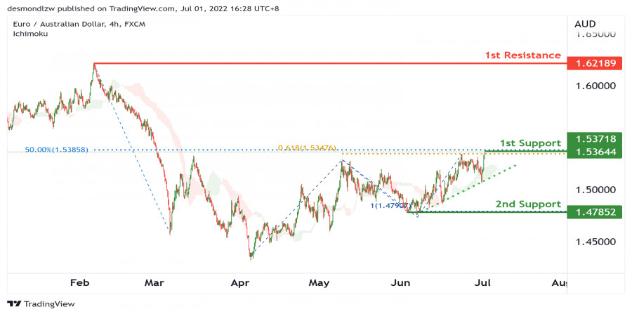 Ожидается дальнейшее снижение пары EUR/AUD. Прогноз на 1 июля 2022ИнстаФорекс - Instaforex, 3 года назад На 4-часовом графике пара EUR/AUD движется вдоль восходящей линии тренда и выше индикатора Облако Ишимоку, что указывает на бычий импульс. По прогнозам, цена продолжит свой рост от 1-го уровня поддержки 1.53718, соответствующего 50% уровня коррекции Фибоначчи и 61.8% проекции Фибоначчи, к 1-му уровню сопротивления 1.62023, который соответствует уровню свинг-хай. В качестве альтернативы цена может развернуться от 1-го уровня поддержки и упасть до 2-го уровня поддержки 1.47852, соответствующего уровню свинг-лоу и 100% проекции Фибоначчи. Торговая рекомендация Вход: 1.53718 Условия для входа: 50% уровень коррекции Фибоначчи и 61.8% проекция Фибоначчи Тейк-профит: 1.62023 Условия для фиксации прибыли: уровень свинг-хай Стоп-лосс: 1.47852 Условия для активации ордера стоп-лосс: уровень свинг-лоу, 100% проекция Фибоначчи Материал предоставлен компанией InstaForex - www.instaforex.com |