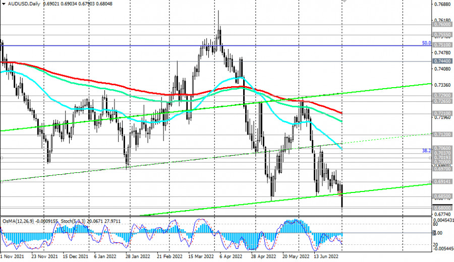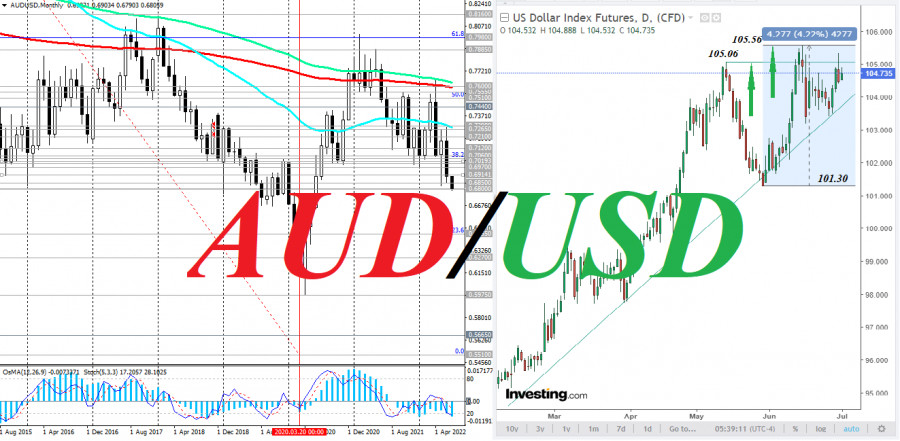 AUD/USD: накануне заседания РБ АвстралииИнстаФорекс - Instaforex, 3 года назад Доллар продолжает доминировать на валютном рынке, начав также новый месяц, квартал, полугодие на позитивной ноте. При этом индекс доллара DXY, оценивающий стоимость доллара к корзине из 6 валют, остается в непосредственной близости от отметки 105.00. На момент публикации данной статьи фьючерсы DXY торгуются вблизи отметки 104.74, также чуть ниже недавних локальных максимумов 105.06, 105.56. Судя по дневному графику DXY, условная пружина сжимается все сильнее, а, как известно из теханализа, фигура «треугольник» является, как правило, фигурой продолжения тренда. Поэтому логично предположить, что пробой его верхней границы, проходящей через отметку 105.56, станет сигналом для наращивания длинных позиций по фьючерсам DXY с перспективой роста в сторону многолетних максимумов 121.29 и 129.05, достигнутых, соответственно, в июне 2001 года и в ноябре 1985 года. С фундаментальной точки зрения пока что все идет именно по такому сценарию (ожиданий дальнейшего укрепления доллара), а главным фактором здесь остается кредитно-денежная политика ФРС, наиболее жёсткая (на текущий момент) в сравнении с другими крупнейшими мировыми центральными банками. Как заявили на этой неделе президент ФРБ Нью-Йорка Уильямс и глава ФРБ Кливленда Лоретта Местер, «разумно дойти до 3,5% - 4,0% ставки по федеральным фондам» в этом году, а затем до 3,50%-4,00% в следующем году, и «монетарная политика должна будет действовать более решительно, чтобы вернуть инфляцию к цели». По словам Уильямса, «изменение ставки на 75 б.п. было правильным», а на июльском заседании ФРС будет обсуждаться вопрос о повышении на 50 или 75 б.п. Собственно говоря, в своих высказываниях они вторят недавним заявлениям главы ФРС Джерома Пауэлла. Так, выступая недавно на Форуме Центробанков ЕЦБ, он сказал, что самый большой риск для ФРС сейчас - это «неспособность восстановить ценовую стабильность», и ФРС необходимо действовать более решительно в этом плане. Что же касается упомянутых нами выше монетарных политик крупнейших мировых центральных банков, то на следующей неделе свое решение по процентным ставкам примет РБ Австралии. Как заявил на прошлой неделе глава РБА Филип Лоу, «австралийцы должны быть готовы к повышению процентных ставок». По его мнению, ставки все еще «очень низкие» и важно, чтобы более высокая инфляция не привела к росту общественных ожиданий и требований по заработной плате. «Уровень процентных ставок все еще очень низок для экономики с низким уровнем безработицы и высокой инфляцией», - сказал также Лоу. Действительно, инфляция в Австралии, как и во всем мире, в настоящий момент ускоряется. В 1-м квартале текущего года индекс потребительской инфляции CPI в Австралии вырос на +5,1% (против прогноза роста на +4,6% и значения +3,5% в предыдущем квартале). Усеченный средний индекс потребительских цен вырос на +3,7% (в годовом выражении) после роста на +2,6% в 4-м квартале 2021 года, превысив прогноз (+3,4%) и определенный РБА целевой диапазон 2%-3%. По прогнозу экономистов, в 3-м квартале годовой темп инфляции в Австралии превысит 7%, что может заставить РБА к началу следующего года поднять ключевую ставку до 2,75%. В то же время рынок труда в стране остается стабильным. Как показало Австралийское бюро статистики (ABS) в последних данных, опубликованных в июне, в мае уровень безр