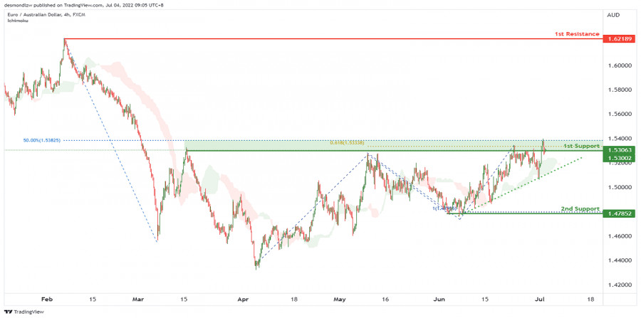 EUR/AUD: ожидается дальнейшее развитие восходящей тенденции. Прогноз на 4 июля 2022ИнстаФорекс - Instaforex, 3 года назад На 4-часовом графике пара EUR/AUD движется выше индикатора Облако Ишимоку и вдоль восходящей линии тренда, что указывает на бычий импульс. Ожидается, что цена продолжит свой рост от 1-го уровня поддержки 1.53002, соответствующего 61.8% проекции Фибоначчи и 50% уровню коррекции Фибоначчи, до 1-го уровня сопротивления 1.62189, который соответствует уровню свинг-хай. В качестве альтернативы цена может развернуться от 1-го уровня поддержки и упасть ко 2-му уровню поддержки 1.47852, соответствующему уровню свинг-лоу и 100% проекции Фибоначчи. Торговая рекомендация Вход: 1.53002 Условия для входа: 61.8% проекция Фибоначчи и 50% уровень коррекции Фибоначчи Тейк-профит: 1.62189 Условия для фиксации прибыли: уровень свинг-хай Стоп-лосс: 1.47852 Условия для активации ордера стоп-лосс: уровень свинг-лоу, 100% проекция Фибоначчи Материал предоставлен компанией InstaForex - www.instaforex.com |