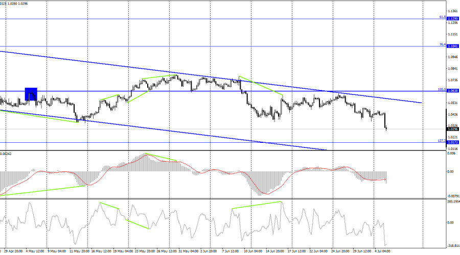 EUR/USD. 5 июля. Евро рухнул как подкошенныйИнстаФорекс - Instaforex, 3 года назад Добрый день, уважаемые трейдеры! Пара EUR/USD в понедельник торговалась вдоль уровня коррекции 200,0% - 1,0430. Складывалось впечатление, что европейская валюта и на этой неделе не сможет продолжить процесс падения, который хорошо заметен на старших графиках. В понедельник в США был еще и выходной день (День независимости). Однако уже во вторник трейдеров ждал откровенный сюрприз. Европейская валюта утром резко начала падение и за два часа упала на 140 пипсов. В это время из информационного фона был только индекс деловой активности в сфере услуг за июнь. И с ним нужно разобраться более подробно, чтобы понять, что он не имеет никакого отношения к падению евровалюты в бездну. Каждый месяц публикуется два значения индекса деловой активности: предварительное и финальное. Как правило, финальное полностью совпадает с предварительным, поэтому реакция трейдеров следует обычно на предварительное. Также было и на этот раз. После майского значения 56,1 в июне показатель составил 53. И первое значение индекса показало 52,8. Таким образом, финальное значение, вышедшее как раз сегодня утром, оказалось даже немного лучше предварительного. Соответственно, евровалюта, если и должна была вообще реагировать на этот отчет, то ростом, а не падением. Но даже если закрыть глаза на этот момент, падение евро началось за один час до выхода индекса PMI. Поэтому я считаю, что этот индекс и обвал евро никак не связаны. Получается, что трейдеры несколько недель выжидали, а потом без какого-либо события возобновили массовые распродажи евро, максимально неожиданно. Если даже взглянуть на 4-часовой график, то не произошло вообще ничего из ряда вон выходящего. Падение началось задолго до сегодняшнего дня, а общее настроение трейдеров остается «медвежьим». Таким образом, главной неожиданностью стал факт падения евровалюты именно сегодня, когда не было важного информационного фона. На 4-часовом графике пара выполнила разворот в пользу американской валюты и продолжает процесс падения в направлении коррекционного уровня 127,2% - 1,0173. Закрепление курса пары над нисходящим трендовым коридором, который продолжает характеризовать настроение трейдеров как «медвежье», позволит рассчитывать на рост евровалюты в направлении уровня коррекции 76,4% - 1,1041. Назревающих дивергенций сегодня не наблюдается ни у одного индикатора. Отчет Commitments of Traders (COT):