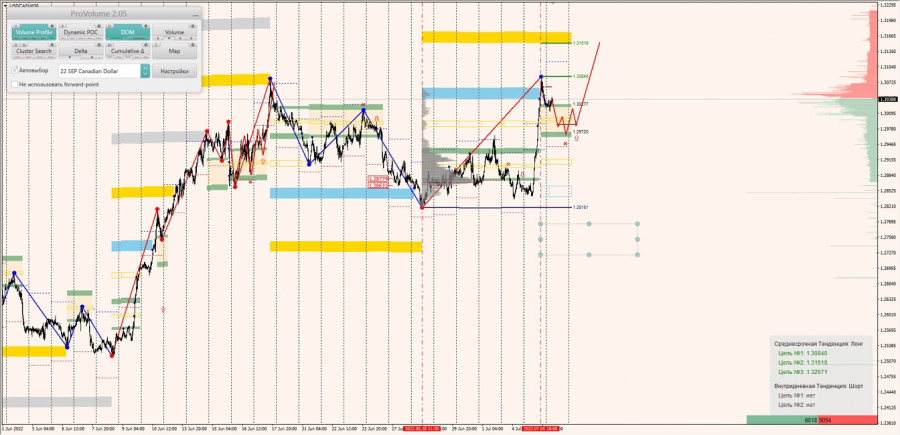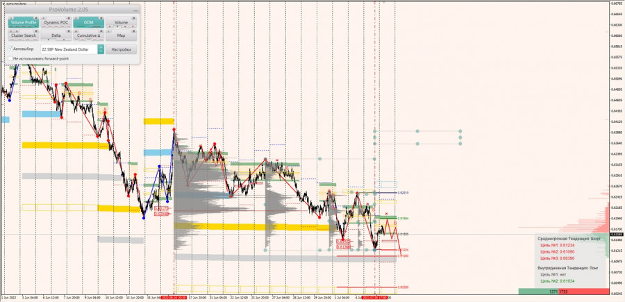 Среднесрочная тенденция: в шорт. Максимальное скопление объемов среднесрочной тенденции расположено в диапазоне по котировкам 0.62048-0.62173. В настоящий момент по паре совершаются инвестиционные операции ниже, указывая на силу продавцов. Но объемы последнего шортового импульса (0.61308-0.61432) располагаются ниже текущего положения цены, что является препятствием для полноценного входа в продажи, но пока не является полноценным сигналом на возможную покупку пары. Плюс наблюдаем закрепление пары выше зоны 1/4, что является внутридневным лонговым импульсом. И до момента входа в возможные продажи необходимо дождаться отработки целей этого внутридневного импульса (0,61934)