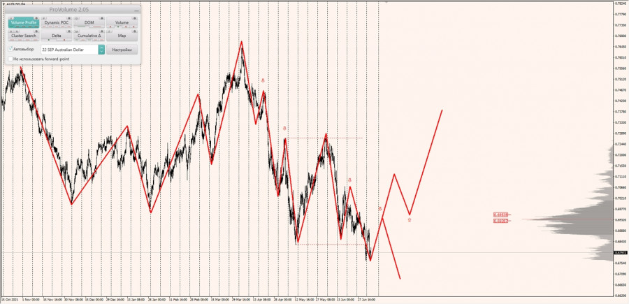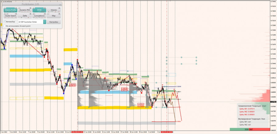 Долгосрочная тенденция: в шорт. Максимальное скопление объемов текущего контракта расположено в диапазоне по котировкам 0.69287-0.69535. В настоящий момент по паре совершаются инвестиционные операции ниже, указывая на силу продавцов.