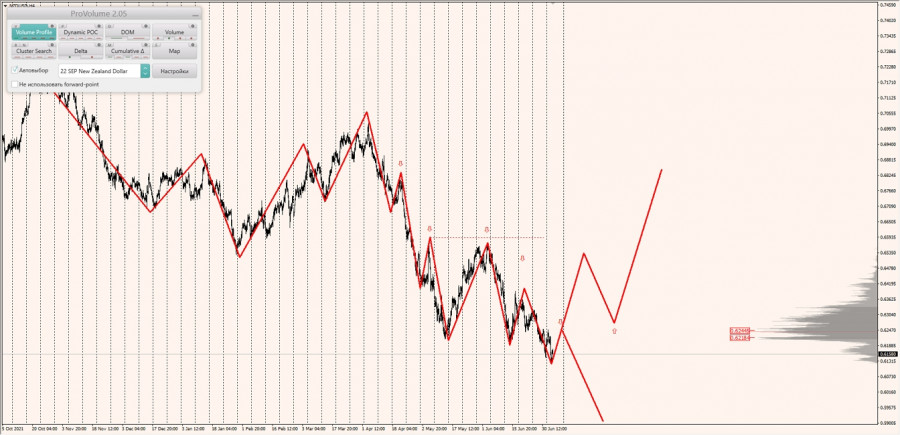 Долгосрочная тенденция: в шорт. Максимальное скопление объемов текущего контракта расположено в диапазоне по котировкам 0.62184-0.62445. В настоящий момент по паре совершаются инвестиционные операции ниже, указывая на силу продавцов.