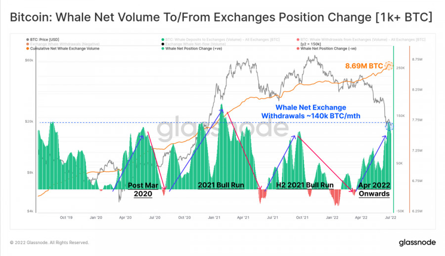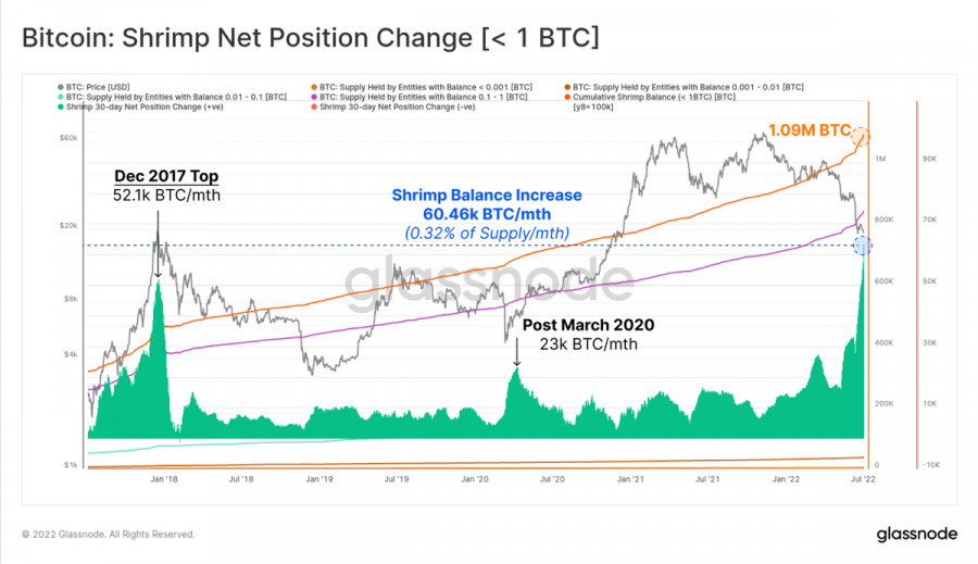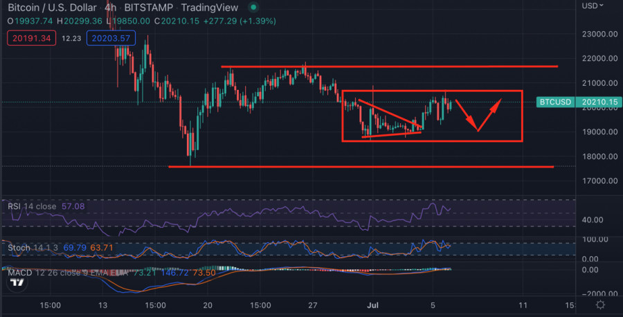 Цена Биткоина приобретает восходящий тренд при агрессивном накоплении: что это значит?ИнстаФорекс - Instaforex, 3 года назад За последние две недели Биткоину удалось стабилизироваться в диапазоне $19k-$21k. При этом наблюдается серьезная консолидация цены в данном диапазоне, благодаря чему попытка медведей пробить рубеж $19k оказалась провальной. Характер защиты нижней границы диапазона указывает на активизацию покупательской аудитории и готовность инвесторов двигать цену вверх к ключевому уровню сопротивления на отметке $21k. Ценовой успех подкрепляется стартом активного накопления Биткоина всеми группами адресов. Общие темпы накопления превысили показатели в 60 460 BTC в месяц. Другими словами, ежемесячно рынок поглощает около 0,32% от общих объемов Биткоина. Последний рекорд был установлен в 2017 году, когда показатель поглощаемых монет BTC достигал 52 тысяч. Важно остановиться подробнее на китах, которые за последний месяц аккумулировали почти 9 миллионов монет, что является вторым крупнейшим показателем за последние 5 лет. Все эти факторы косвенно указывают на постепенно растущий спрос на первую криптовалюту. Что касается технической стороны, то здесь важно отметить несколько потенциальных целей. В условиях ограниченной ликвидности игрокам необходимо пользоваться каждой возможностью получить дополнительное "топливо" для дальнейшего освоения широкого диапазона $20k-$30k. В районе $21,5k-$22k сосредоточено большое число ликвидаций, которые могут помешать более мощному восходящему импульсу в дальнейшем. Однако попытке достичь финального диапазона в текущем положении Биткоину мешает серьезный уровень сопротивления на отметке $20,2k. Актив в очередной раз достиг данной области, но не смог импульсно пробить ее, что может свидетельствовать об очередном откате к нижней границе области в районе $19k. Другими словами, медведям не удалось реализовать нисходящий сценарий, благодаря уверенной защите $19k. Впоследствии цена BTC на растущих объемах возобновила импульсное движение к уровню $20,2k, но продавцы не пустили котировки дальше. Восходящие рывки не имеют успеха на текущем этапе, так как в июне рынок пережил масштабную распродажу. Гигантские объемы монет BTC осуществляют давление на цену криптовалюты, что негативно влияет на ее восходящий потенциал. Темпы накопления не позволяют цифровой монете реализовать необходимые импульсные сигналы. Помимо этого, рынок остается в области экстремального страха. Несмотря на старт активного накопления, далеко не все инвесторы участвуют в закупке. Недавний приток капитала в шортовые BTC-продукты также говорит о медвежьих планах рынка. Число уникальных адресов также остается на уровне 850 тысяч, а суточные объемы торгов превышают отметку в $35 миллиардов только при повышенной волатильности. Другими словами инвесторы не уверены в формировании локального дна и ожидают повторного снижения Bitcoin ниже $19k. Однако этот процесс требует фундаментального триггера, а потому этот процесс может занять месяцы. По состоянию на 6 июля нет предпосылок для серьезного восходящего движения или пробоя уровня $19k. Продавцы и покупатели не обладают необходимыми объемами для реализации своих целей. Поэтому, вероятнее всего, стоит ожидать флетового движения с локальными вспышками волатильности и заколами важных уровней. Вместе с тем те