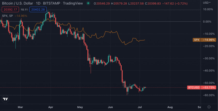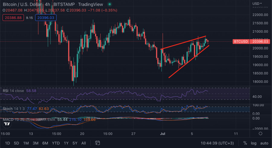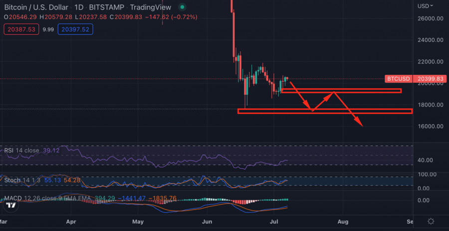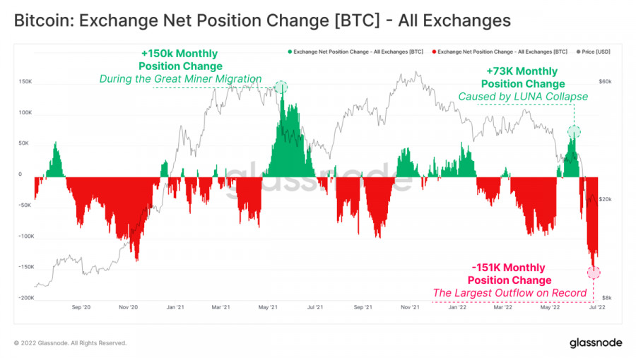 Стоит ли ждать снижения Биткоина после публикации тезисов ФРС?ИнстаФорекс - Instaforex, 3 года назад В жестких макроэкономических и геополитических условиях Биткоину удалось остановить падение и начать консолидацию в рамках узкого диапазона $19k-$21k. Актив практически полностью очистился от заемного капитала и спекулятивных инвесторов, что позитивно сказывается на стабильности движения цены. Это позволяет Bitcoin совершать восходящие рывки, благодаря чему актив закрепился выше $20k и даже сумел пройти важный уровень сопротивления $20,2k. Все позитивные процессы проходят во время относительного затишья фундаментальных факторов, которые оказывают ключевое влияние на движение цены криптовалюты. Помимо локальных успехов на дневном графике, Биткоин укрепляется на фундаментальном фронте. После массовой распродажи и рекордной фиксации убытков в июне, долгосрочные инвесторы возобновили интерес к BTC. Эксперты Glassnode сообщают, что в в начале июля зафиксирован самый крупный в истории наблюдений отток монет Bitcoin с криптобирж. Повышенное внимание инвесторов указывает на растущий интерес к криптовалюте в качестве высокодоходного инструмента и потенциального средства хеджирования рисков, когда рынок перейдет в следующую стадию. На этом фоне вполне можно ожидать постепенного разрыва корреляции с фондовыми индексами, и установления созависимости с золотом. Однако идиллию Биткоина могут нарушить опубликованные результаты заседания ФРС. Чиновники ведомства озвучили ряд негативных заявлений, которые могут спровоцировать новую волну паники на рынке. Члены регуляторного органа сообщили, что видят повышенный риск ускоренного роста инфляции, а прогнозы не отражают реального положения дел. Другими словами, ФРС понимает, что на текущем этапе принятых мер для борьбы с ростом потребительских цен недостаточно. Здесь можно сделать вывод, что Федрезерв психологически настраивает рынок на еще один скачок инфляции. Возможно, этот тезис был озвучен для того, чтобы предотвратить июньскую ситуацию, когда уровень инфляции обновил 40-летний максимум и вверг рынок в хаос. Помимо этого, чиновники заявили, что на июльском заседании продолжится агрессивная монетарная политика. ФРС планирует поднять ставку на 0,5%-0,75%. В случае, если индекс потребительских цен окажется выше уровня ожиданий, нет сомнений, что регулятор поднимет ставку на 75 базисных пунктов. При этом чиновники отметили, что в будущем возможна еще более жесткая политика по сдерживанию инфляции. Учитывая недавнее выступление Пауэлла, где были озвучены схожие тезисы, рынок подготовился к надвигающейся ситуации, и негативные прогнозы уже заложены в цену активов. ФРС явно готовит рынок к вероятному росту инфляции или сохранению на уровне 8%. Судя по нейтральной реакции, рынки будут дожидаться статистики по инфляции прежде чем принимать решения. Однако сохранение курса на повышение ставки и серьезная угроза роста индекса инфляции негативно повлияют на будущие предпочтения инвесторов. Вполне вероятно, что нас ожидает очередная волна продаж, спровоцированная негативными новостями, что может привести к очередному кризису ликвидности на рынке и снижению инвестиционной активности. Самым важным в отчете ФРС является тезис о том, что ведомству не удается взять под контроль инфляцию в обозримой перспе