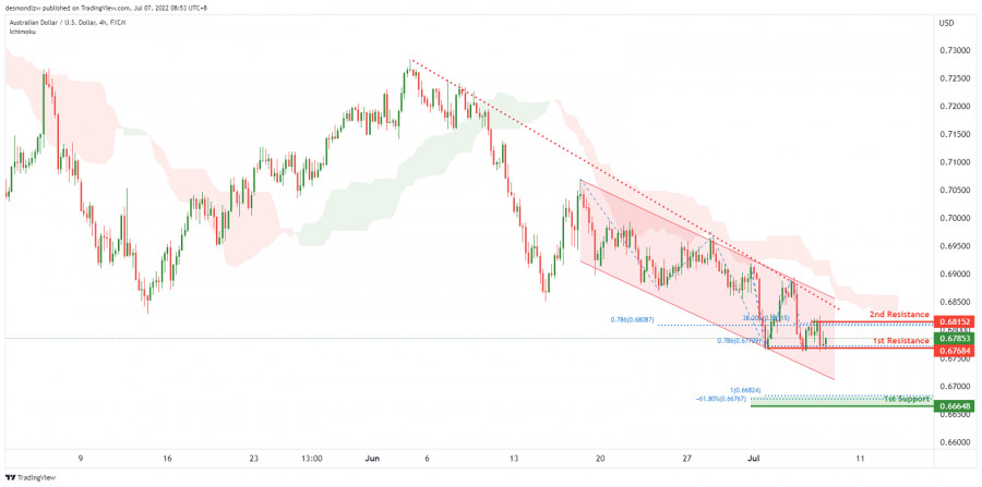 AUD/USD: возможно дальнейшее развитие нисходящей тенденции. Прогноз на 7 июля 2022ИнстаФорекс - Instaforex, 3 года назад На 4-часовом графике пара AUD/USD движется ниже индикатора Облака Ишимоку, вдоль нисходящей линии тренда и в рамках нисходящего канала, что указывает на медвежий импульс. Ожидается, что цена упадет от 1-го уровня сопротивления 0.67684, соответствующего нескольким уровням свинг-лоу и 78.6% проекции Фибоначчи, до 1-го уровня поддержки 0.66648, который соответствует -61.8% уровню расширения Фибоначчи и 100% проекции Фибоначчи. В качестве альтернативы цена может развернуться от 1-го уровня сопротивления и укрепиться до 2-го уровня сопротивления 0.68152, соответствующего уровню свинг-хай, 78.6% проекции Фибоначчи и 38.2% уровню коррекции Фибоначчи. Торговая рекомендация Вход: 0.67684 Условия для входа: несколько уровней свинг-лоу, 78.6% проекция Фибоначчи Тейк-профит: 0.66648 Условия для фиксации прибыли: -61.8% уровень расширения Фибоначчи, 100% проекция Фибоначчи Стоп-лосс: 0.68152 Условия для активации ордера стоп-лосс: уровень свинг-хай, 78.6% уровень коррекции Фибоначчи, 38.2% уровень коррекции Фибоначчи Материал предоставлен компанией InstaForex - www.instaforex.com |