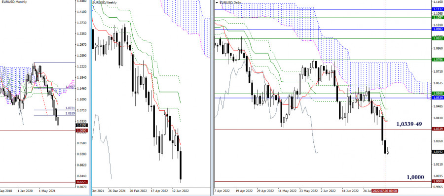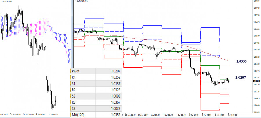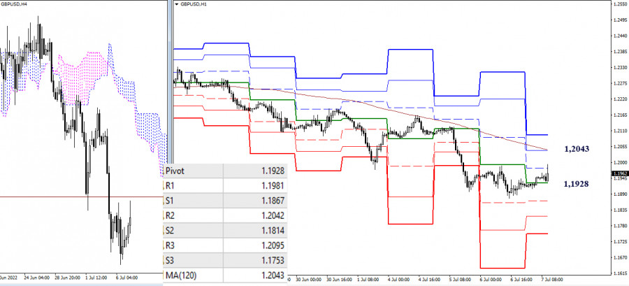 EUR/USD и GBP/USD 7 июля – рекомендации технического анализаИнстаФорекс - Instaforex, 3 года назад EUR/USD Старшие таймфреймы Игроки на понижение вчера сумели продолжить снижение. В результате потенциал усиления медвежьих настроений по-прежнему сохраняется. Понижательные ориентиры, как и отмечалось ранее, в сложившейся ситуации можно отметить на 1,0000 (психологический уровень) и 0,8225 (минимальный экстремум 2000 года). Пройденные поддержки (1,0339-49) при развитии восходящей коррекции могут оказать сопротивление, далее в работу вступят уровни сопротивления дневного креста Ишимоку. Н4 – Н1 Преимущества младших таймфреймов сейчас принадлежат игрокам на понижение. Действующим является нисходящий тренд. Среди дальнейших медвежьих ориентиров внутри дня можно отметить поддержки классических Пивот-уровней (1,0137 – 1,0092 – 1,0022). В настоящий момент пара находится в зоне коррекции, тестируя центральный Пивот-уровень дня (1,0207). Пробой уровня и продолжение коррекции позволят далее рассматривать в качестве ориентира сопротивление недельной долгосрочной тенденции (1,0353). Данный уровень (1,0353) отвечает за действующий баланс сил младших таймов. Его преодоление и разворот изменят расстановку сил в пользу игроков на повышение. *** GBP/USD Старшие таймфреймы Игроки на понижение вчера продолжили снижение, но результативность отсутствовала. Торможение и возврат пары выше 1,2000 может помешать игрокам на понижение продолжить снижение. В этом случае будет развиваться новая восходящая коррекция, её ориентирами станут сопротивления дневного креста Ишимоку (1,2104 – 1,2151 – 1,2237 – 1,2322) и недельный краткосрочный тренд, который сейчас расположен на 1,2270. Если игроки на понижение сумеют активно продолжить нисходящий тренд, то их основным ориентиром будет служить минимальный экстремум 2020 года (1,1411). Н4 – Н1 Основное преимущество находится на стороне игроков на понижение. Ориентирами для продолжения снижения внутри дня являются поддержки классических Пивот-уровней, которые сегодня расположены на 1,1867 – 1,1814 – 1,1753. В настоящий момент идёт развитие восходящей коррекции. Игроки на повышение уже завладели центральным Пивот-уровнем дня (1,1928), поэтому основным ориентиром коррекции сейчас стала недельная долгосрочная тенденция (1,2043), которая отвечает за баланс сил. Пробой, закрепление выше и разворот мувинга отдадут преимущества младших таймов игрокам на повышение. *** При техническом анализе ситуации используются: старшие таймфреймы – Ichimoku Kinko Hyo (9.26.52) + уровни Фибо Киджун Н1 – Pivot Points (классические) + Moving Avarage 120 (недельная долгосрочная тенденция) Материал предоставлен компанией InstaForex - www.instaforex.com |