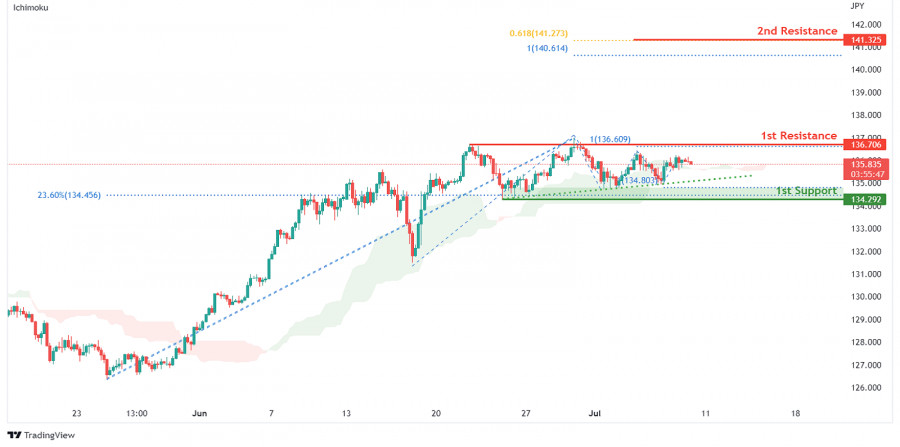 USD/JPY: ожидается усиление бычьего импульса. Прогноз на 8 июля 2022ИнстаФорекс - Instaforex, 3 года назад На 4-часовом графике пара USD/JPY движется вдоль восходящей линии тренда и выше индикатора Облако Ишимоку, что указывает на бычий импульс. По прогнозам, цена вырастет до 1-го уровня сопротивления 136.706, соответствующего уровню свинг-хай, выступающему в качестве сопротивления, и 100% проекции Фибоначчи. Как только цена пробьет 1-й уровень сопротивления, ожидается, что бычий импульс подтолкнет цену ко 2-му уровню сопротивления 141.325, который соответствует 61.8% и 100% проекции Фибоначчи. В качестве альтернативы цена может упасть до 1-го уровня поддержки 134.292, соответствующему уровню свинг-лоу, выступающему в качестве поддержки, 100% проекции Фибоначчи и 23.6% уровню коррекции Фибоначчи. Торговая рекомендация Вход: 136.706 Условия для входа: уровень свинг-хай, выступающий в качестве сопротивления, и 100% проекции Фибоначчи Тейк-профит: 141.325 Условия для фиксации прибыли: 61.8% проекция Фибоначчи и 100% проекция Фибоначчи Стоп-лосс: 134.292 Условия для активации ордера стоп-лосс: уровень свинг-лоу, выступающий в качестве поддержки, 100% проекция Фибоначчи, 23.6% уровень коррекции Фибоначчи Материал предоставлен компанией InstaForex - www.instaforex.com |