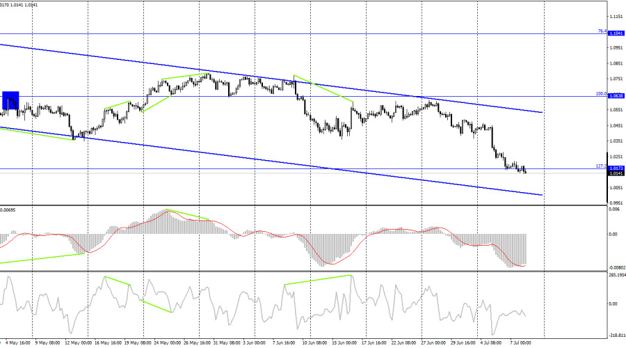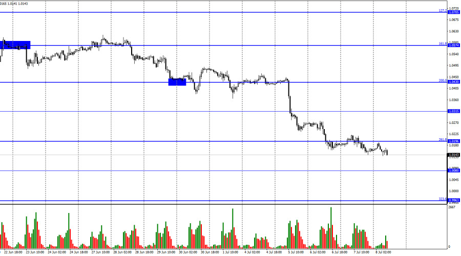 EUR/USD. 8 июля. Трейдеры ждут сильный Nonfarm Payrolls и уже начали покупать долларИнстаФорекс - Instaforex, 3 года назад Добрый день, уважаемые трейдеры! Пара EUR/USD в пятницу возобновила процесс падения в направлении ближайшего уровня 1,0080. Отбой котировок от этого уровня может позволить выполнить разворот в пользу европейской валюты и начать рост в направлении уровня Фибо 261,8% - 1,0196. А закрепление под 1,0080 повысит вероятность дальнейшего падения в направлении коррекционного уровня 323,6% - 0,9963. Однако сегодня на первом месте будут стоять не графические сигналы и анализ, а информационный фон. Во второй половине дня в США выйдет отчет Nonfarm Payrolls, который обычно всегда вызывает сильные движения на рынке. Необязательно трендовые, необязательно логичные, но практически всегда сильные. Трейдеры-медведи начали избавляться от пары евро-доллар практически с самого утра. А сама пара евро-доллар продолжает торговаться на минимальных за 20 лет значениях. Таким образом, трейдеры не пожелали даже немного откатиться наверх, чтобы потом с новыми силами возобновить распродажи. С моей точки зрения, это говорит об их готовности увидеть сегодня сильный отчет по рынку труда. Прогнозы говорят о том, что по итогам июня было создано от 270К до 300К новых рабочих мест. Кто-то может сказать, что это низкое значение, но я считаю, что такое значение высокое. Следует напомнить, что до пандемии прирост рабочих мест на 200-300К считался отличным результатом. Потом началась пандемия и в один месяц пэйроллы потеряли 21 млн! Поэтому в следующие два года этот показатель восстанавливался ускоренными темпами, а трейдеры уже привыкли к тому, что каждый месяц создается 400-700К новых рабочих мест. Я хочу сказать, что даже если реальное значение пэйроллов будет не больше 240-250К, это будет позитивом для доллара. А трейдеры уже начали(точнее продолжили) его скупать, поэтому какая вообще разница, каким будет отчет Nonfarm, если американская валюта и без него отлично растет? Лишь очень слабое значение может привести к росту пары евро-доллар. На 4-часовом графике пара выполнила падение к уровню коррекции 127,2% - 1,0173 и закрепление под ним. Таким образом, падение котировок может быть продолжено в направлении следующего уровня коррекции 161,8% - 0,9581. Назревающих дивергенций сегодня не наблюдается ни у одного индикатора. Нисходящий трендовый коридорпо-прежнему характеризует настроение трейдеров, как «медвежье». Отчет Commitments of Traders (COT):