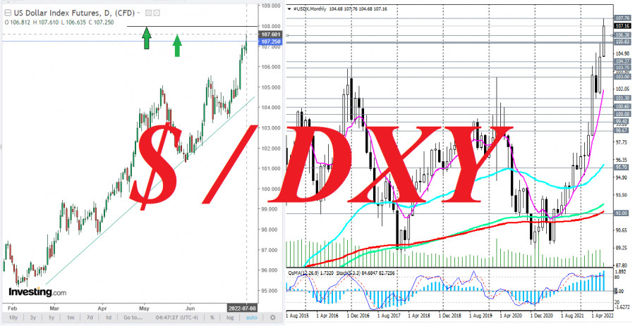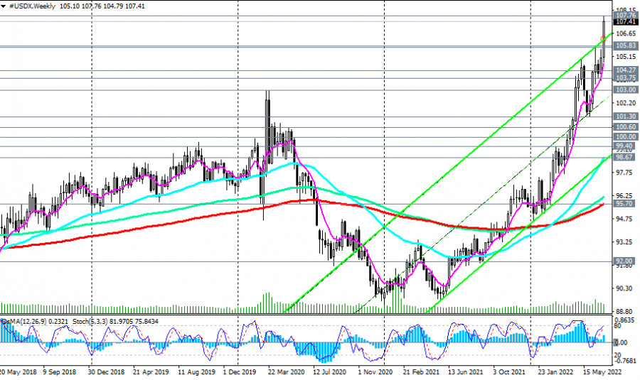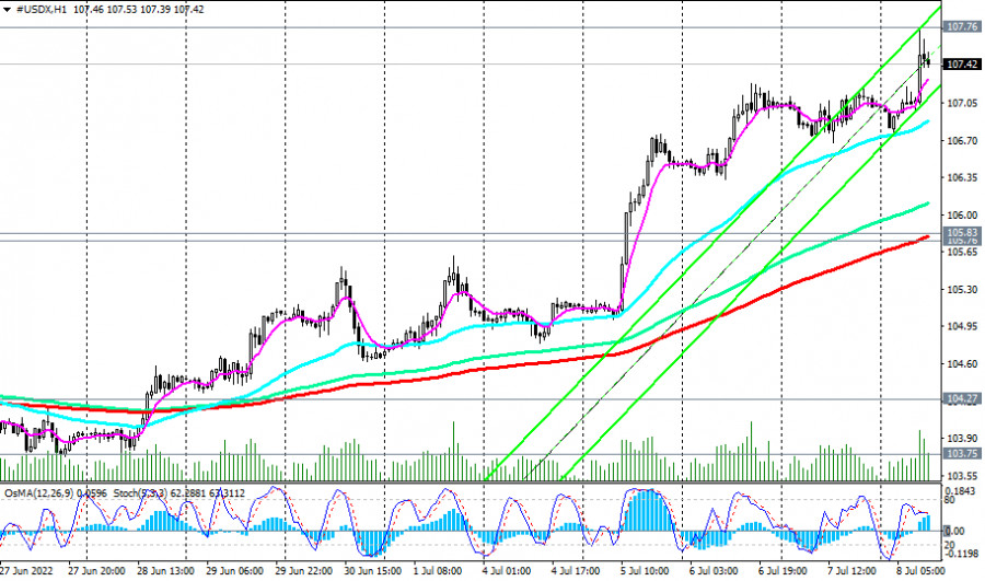 Индекс доллара CFD #USDX: технический анализ и торговые рекомендации на 08.07.2022ИнстаФорекс - Instaforex, 3 года назад Сегодня в конце первой полной недели месяца доллар сохраняет позитивную динамику, в то время как его индекс DXY остаётся выше отметки 107.00 (на момент публикации данной статьи фьючерсы DXY торгуются вблизи отметки 107.25). Пробой сегодняшнего локального максимума 107.60 станет сигналом для наращивания длинных позиций по фьючерсам DXY с перспективой роста в сторону многолетних максимумов 121.29 и 129.05, достигнутых, соответственно, в июне 2001 года и ноябре 1985 года. Цена (в торговом терминале МТ4 индекс доллара отражается как CFD #USDX) пробила верхнюю границу восходящего канала на дневном и недельном графиках (отметка 106.38), а технические индикаторы OsMA и Стохастик находятся на стороне покупателей. На месячном графике CFD #USDX Стохастик с августа прошлого года находится в зоне «перекупленности», не желая оттуда выходить, что также говорит о сильном «бычьем» импульсе. Таким образом, с технической точки зрения также все говорит пока что в пользу длинных позиций по доллару и его индексу. В альтернативном сценарии сигналом начала нисходящей коррекции доллара и индекса доллара DXY и открытия коротких позиций станет пробой уровня поддержки 105.83 (ЕМА200 на 1-часовом графике). В этом случае CFD #USDX направится вглубь восходящих каналов на дневном и недельном графиках, в сторону уровня поддержки 103.75 (ЕМА50 на дневном графике) и локального уровня поддержки 103.00 (максимумы марта 2020 года). Однако для такого сценария и, возможно, более глубокого снижения необходимы сильные фундаментальные факторы. А их пока что нет (см. также сегодняшний «Фундаментальный анализ»). Рынки ожидают продолжения цикла повышения процентных ставок ФРС и дальнейшего роста доллара. Пробой локальных уровней сопротивления 107.76, 108.00 откроет CFD #USDX дорогу в сторону многолетних максимумов 121.00, достигнутых летом 2001 года. Уровни поддержки: 107.00, 106.38, 106.00, 105.83, 105.76, 104.27, 103.75, 103.00, 102.00, 101.30, 100.60, 100.00, 99.40, 98.67, 95.70 Уровни сопротивления: 107.76, 108.00
