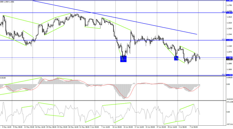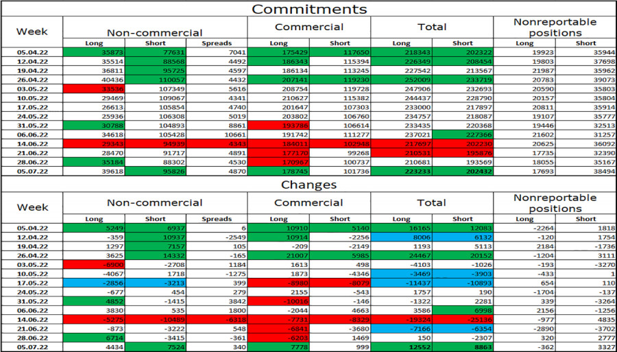 Добрый день, уважаемые трейдеры! На часовом графике пара GBP/USD еще раз выполнила рост к нисходящей линии тренда и еще один отбой от этой линии. Таким образом, был выполнен разворот в пользу валюты США и начат новый процесс падения в направлении уровня 1,1933. Евро с фунтом начинают новую неделю с новых потерь, даже не дожидаясь важных событий или новостей. С моей точки зрения, это говорит о том, что настроение трейдеров остается «медвежьим». По британцу еще и два новых сигнала на продажу образовалось, так как было два отбоя от линии тренда. Таким образом, уже в ближайшие часы котировки могут опуститься к уровню 1,1933 и закрепиться под ним. В этом случае падение может быть продолжено в направлении следующего уровня коррекции 685,4% - 1,1684. Я буду ожидать рост британца не ранее закрепления над линией тренда. Тем временем, будущий уход Бориса Джонсона в отставку, которые должен случится осенью, практически никак не повлиял на настроение трейдеров. Мы увидели небольшой рост британской валюты, но неизвестно, был ли он связан с политическим кризисом в Великобритании. Рост был очень слабым, поэтому он мог быть простой коррекцией, которая не обязана иметь под собой определенные причины. На этой неделе ближайшим интересным днем будет среда, когда в США выйдет отчет по инфляции за июнь, а в Великобритании выйдут данные по промышленному производству и ВВП. Напомню, что показатели ВВП, которые отображают экономический рост, волнуют сейчас экономистов по всему миру, так как экономики многих стран находятся на грани рецессии. Или, если и не на грани, то в опасной близости. Больше всего сейчас все говорят о рецессии в США, но Великобритания недалеко ушла от США и тоже может столкнуться с отрицательным ростом экономики. Инфляция растет и там, и там, что вынуждает центральные банки продолжать идти по пути ужесточения денежно-кредитной политики. А чем выше поднимаются ставки, тем больше становится вероятность рецессии. На 4-часовом графике пара выполнила новый разворот в пользу валюты США и закрепление под уровнем 1,1980. Таким образом, процесс падения может быть продолжен в направлении следующего уровня коррекции 161,8% - 1,1709. Также была образована «медвежья» дивергенция у индикатора CCI, которая повышает вероятность продолжения падения фунта. На рост британца я пока не рассчитываю. Отчет Commitments of Traders (COT):