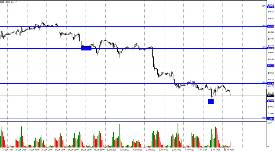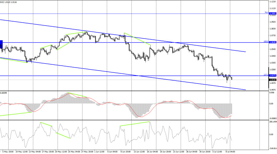 EUR/USD. 11 июля. Евровалюта начинает новую неделю новым падением.ИнстаФорекс - Instaforex, 3 года назад Добрый день, уважаемые трейдеры! Пара EUR/USD начала новую неделю новым разворотом в пользу американской валюты и началом нового падения в направлении уровня 1,0080. Календарь экономических событий сегодня абсолютно пустой, а ночью по понятным причинам никаких новостей нет и быть не могло. Тем не менее, трейдеры-медведи решили не раскачиваться слишком долго и сразу же начали распродавать евровалюту, к чему все уже давно привыкли. Я не могу сказать, что так происходит из-за каких-то конкретных факторов. Евровалюта падает уже давным-давно и ничего не может противопоставить американской валюте. На этой неделе «медвежье» настроение трейдеров, вероятнее всего, сохранится. Однако я могу также предположить, что падение европейской валюты связано с пятничным отчетом по пэйроллам в США. Напомню, что реальное значение превысило ожидания трейдеров, поэтому отчет можно считать сильным. Однако в пятницу после того, как пара падала в течение четырех дней подряд, трейдеры все же решили немного скорректировать ее. Зато сегодня мы можем видеть запоздалую реакцию на сильную статистику из США. Уровень безработицы и средние заработные платы тоже были на высоте. А вот следующего важного отчета придется ждать аж до среды. Именно в среду в США выйдет отчет по инфляции за июнь, который имеет огромное значение для доллара. Если инфляция опять покажет рост, это будет означать, что ФРС повысит ставку в конце месяца на 0,75%. Безусловно, это «бычий» фактор для американской валюты и уже в ближайшее время пара сможет уйти ниже исторического уровня 1,0000. Таким образом, пока что я не вижу причин покупать евровалюту или хотя бы рассчитывать на ее сильный рост. ЕЦБ по-прежнему озвучивает планы по повышению процентной ставки максимум на 0,5% за следующие два заседания, чего недостаточно, чтобы евровалюта ощутила прилив сил. С такими темпами через пару месяцев мы можем увидеть евро около 0,9000. На 4-часовом графике пара выполнила закрепление под уровнем коррекции 127,2% - 1,0173. Таким образом, падение котировок может быть продолжено в направлении следующего уровня коррекции 161,8% - 0,9581. Назревающих дивергенций сегодня не наблюдается ни у одного индикатора. Нисходящий трендовый коридор по-прежнему характеризует настроение трейдеров, как «медвежье». Отчет Commitments of Traders (COT):