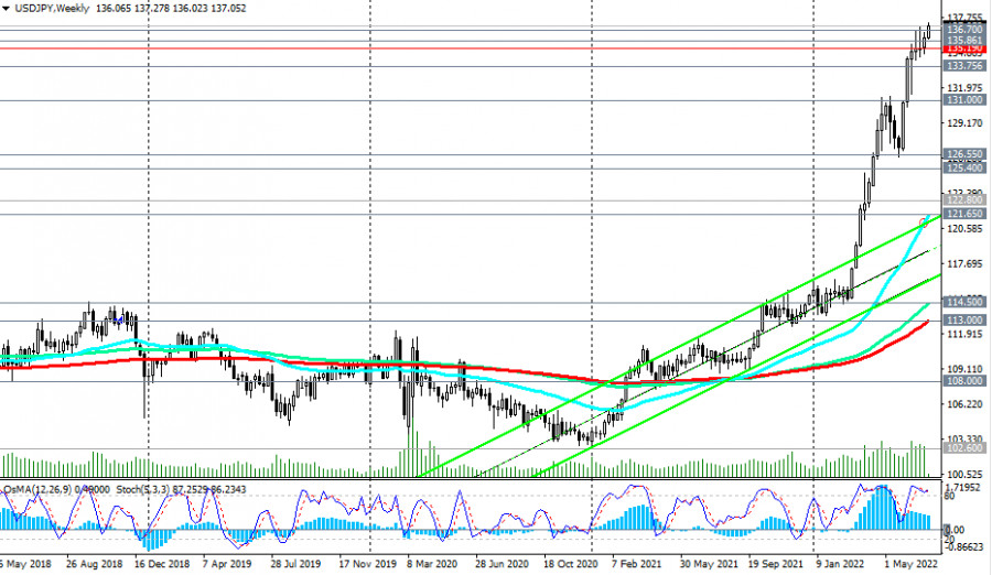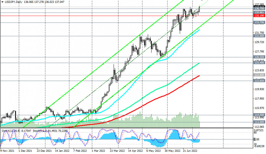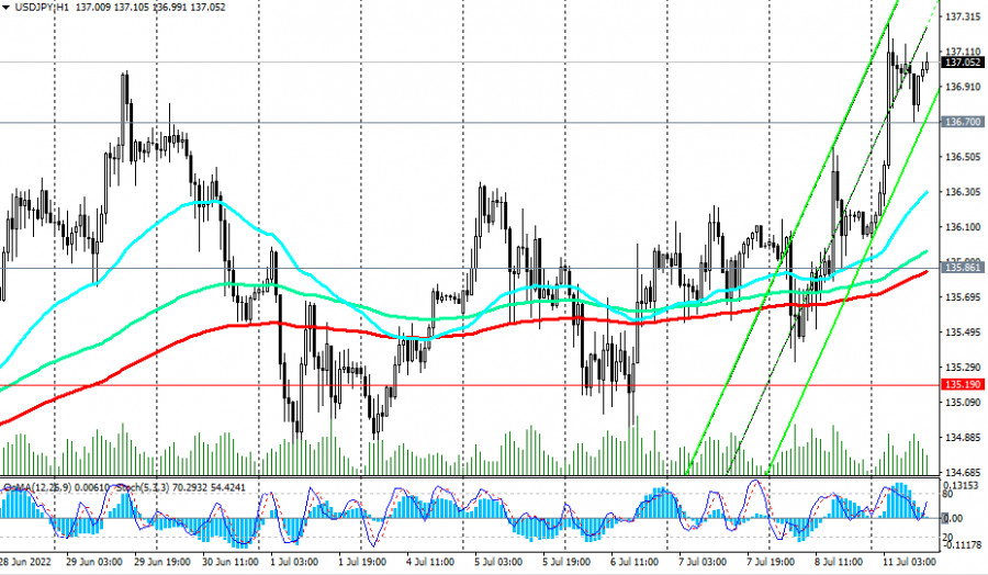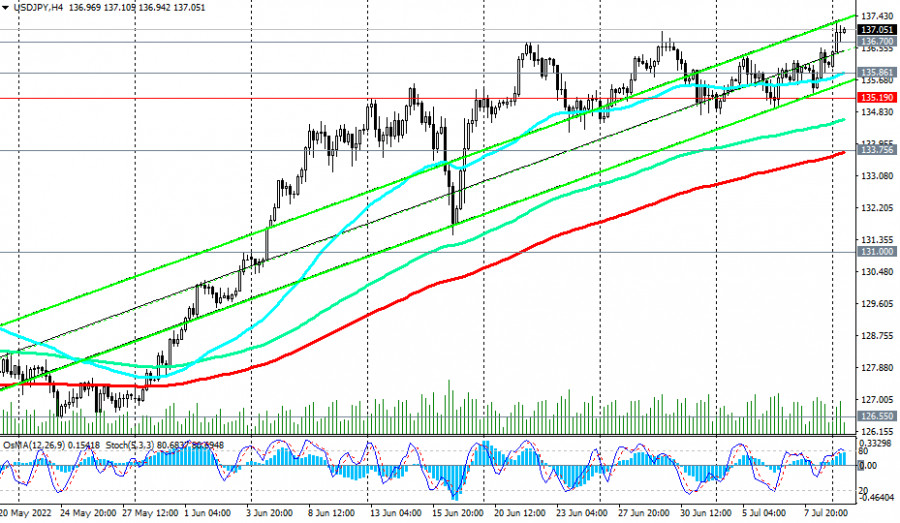 USD/JPY: технический анализ и торговые рекомендации на 11.07.2022ИнстаФорекс - Instaforex, 3 года назад Как мы отметили в нашем сегодняшнем «Фундаментальном анализе», «в ходе сегодняшней азиатской торговой сессии пара USD/JPY пробила очередной психологически значимый уровень 137.00, достигнув внутридневного локального максимума на отметке 137.27. В последний раз вблизи текущих отметок USD/JPY находилась в октябре 1998 года. Котировки пары растут как на фоне тотально укрепляющегося доллара, так и на фоне остающейся слабой иены». «С фундаментальной точки зрения (предположили в нашем обзоре за 08.07.2022) пока что все идет именно по такому сценарию (ожиданий дальнейшего укрепления доллара), а главным фактором здесь остается кредитно-денежная политика ФРС, как мы отметили ранее, наиболее жёсткая (на текущий момент) в сравнении с другими крупнейшими мировыми центральными банками». Расхождение в курсах монетарной политики ФРС и Банка Японии будет, по всей видимости, увеличиваться, создавая предпосылки для дальнейшего роста USD/JPY. В этом случае пара направится в сторону многолетних максимумов вблизи отметки 140.00, достигнутой в июне 1998 года и, возможно, выше – в сторону многолетних максимумов вблизи отметки 147.00, достигнутой в августе 1998 года. Наш предыдущий прогноз полностью оправдался, а намеченные цели (Buy Stop 125.50. Stop Loss 124.40. Take-Profit 125.65, 126.00, 127.00, 128.00, 134.00, 135.00) достигнуты. Более того, цена переписала многолетний максимум 137.00, достигнув нового локального максимума 137.27. В данный момент USD/JPY торгуется вблизи отметки 137.05, сохраняя потенциал к дальнейшему росту. Наилучшим вариантом было бы дождаться «отката, хотя бы, к уровням поддержки 136.00, 135.86, 135.19, 135.00». Тем не менее, учитывая сильный восходящий импульс, подпитываемый в том числе усиливающейся дивергенцией в направленности монетарных политик ФРС и Банка Японии, покупки от текущих отметок также выглядят логично. Пробой локального максимума 137.27 станет сигналом для наращивания длинных позиций. В альтернативном сценарии сигналом для краткосрочных продаж станет пробой уровня поддержки 135.00. Нисходящая коррекция в этом случае может продлиться к уровню поддержки 133.75 (ЕМА200 на 4-часовом графике) и даже ниже – к уровню поддержки 132.30 (ЕМА50 и нижняя линия восходящего канала на дневном графике), где можно выставить новые отложенные ордера на покупку. Более глубокое снижение маловероятно. Уровни поддержки: 136.00, 135.86, 135.19, 135.00, 133.75, 132.30, 131.00, 126.55, 125.40, 122.80 Уровни сопротивления: 138.00, 139.00, 140.00