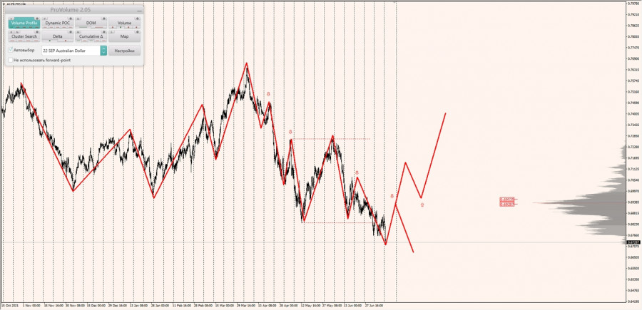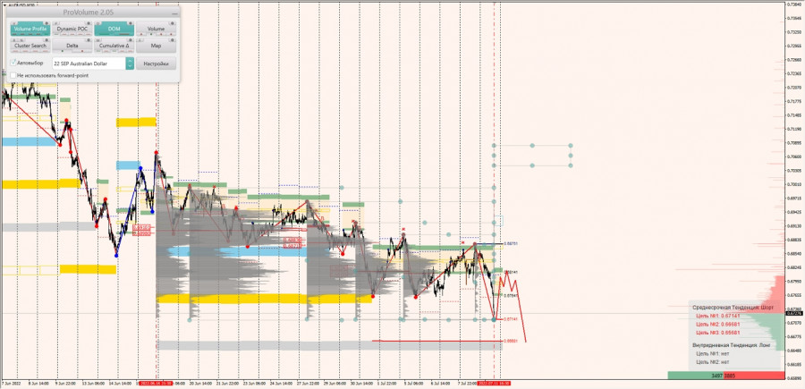 Долгосрочная тенденция: в шорт. Максимальное скопление объемов текущего контракта расположено в диапазоне, по котировкам 0.69287-0.69535. В настоящий момент по паре совершаются инвестиционные операции ниже, указывая на силу продавцов.