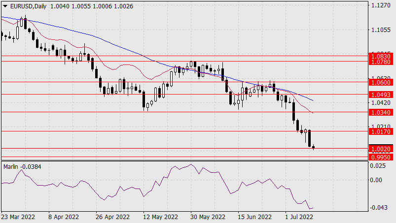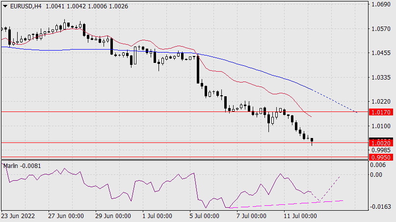 Прогноз по EUR/USD на 12 июля 2022 годаИнстаФорекс - Instaforex, 3 года назад В понедельник евро снизился на 146 пунктов и почти достиг целевой уровень 1.0020. Осциллятор Марлин показал небольшой разворот из зоны перепроданности и цена близка к коррекции, но если произойдёт преодоление целевого уровня 1.0020, то последним усилием «медведей» может быть отработана цель 0.9950. Далее вероятна коррекция в район 1.0100/70.