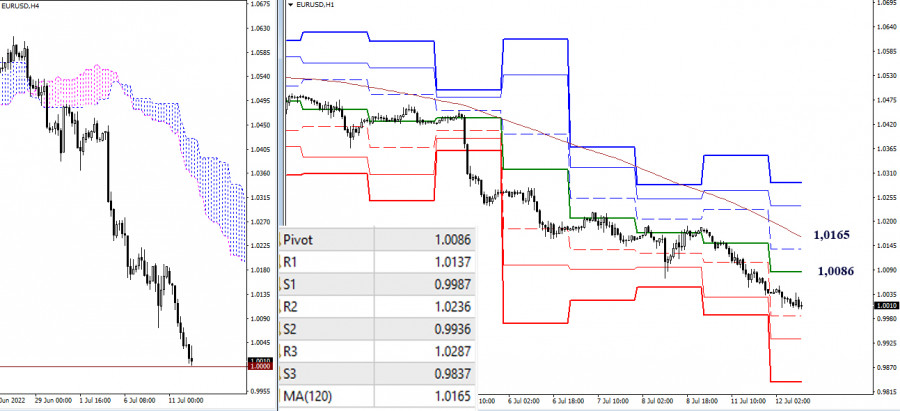 EUR/USD и GBP/USD 12 июля – рекомендации технического анализаИнстаФорекс - Instaforex, 3 года назад EUR/USD Старшие таймфреймы Игроки на повышение не смогли на данном участке реализовать торможение, предпосылки к которому наметились в пятницу прошлой недели. Снижение активно продолжается. Сейчас достигнут значимый психологический уровень 1,0000. Результат взаимодействия определит ближайшие настроения. Торможение, консолидация или отбой это варианты для игроков на повышение. Пробой поддержки 1,0000 и продолжение снижения, желательно с сохранением темпа и результативности, это продолжение медвежьего сценария. Оставленные позади уровни дневного креста Ишимоку сейчас выступают ближайшими сопротивлениями старших таймов, но из-за дальности расположения (первый – 1,0246 Тенкан) они сегодня вряд ли будут актуальны. Н4 – Н1 На младших таймах развивается нисходящий тренд. Ориентирами для снижения внутри дня сейчас служат поддержки классических Пивот-уровней (0,9987 – 0,9936 – 0,9837). В случае возникновения коррекционного подъёма игроков на повышение в первую очередь будут интересовать ключевые уровни сопротивления. Сейчас они расположены на 1,0086 (центральный Пивот-уровень) и 1,0165 (недельная долгосрочная тенденция). Закрепление выше способно изменить действующий баланс сил младших таймов. *** GBP/USD Старшие таймфреймы Фунт также вышел из зоны коррекции и возобновил нисходящий тренд. Наиболее значимые для игроков на понижение ориентиры расположены сейчас в районе психологического уровня 1,5000 и минимального экстремума 2020 года 1,1411. Для игроков на повышение в случае очередного восстановления позиций особый интерес будет представлять зона сопротивлений 1,2000 – 1,2237 (дневной крест + психологический уровень + недельный краткосрочный тренд). Её прохождение сформирует новые перспективы. Н4 – Н1 На младших таймах преимущество принадлежит игрокам на понижение. В настоящий момент они тестируют первую поддержку классических Пивот-уровней (1,1824), далее ориентирами для снижения внутри дня служат вторая (1,1760) и третья (1,1654) поддержки классических Пивот-уровней. Если возникнет коррекционное восстановление, то основной интерес игроков на повышение будет направлен на завоевание ключевых уровней младших таймов, определяющих баланс сил. Сегодня они объединяют свои усилия в районе 1,1930-54 (центральный Пивот-уровень дня + недельная долгосрочная тенденция). *** При техническом анализе ситуации используются: старшие таймфреймы – Ichimoku Kinko Hyo (9.26.52) + уровни Фибо Киджун Н1 – Pivot Points (классические) + Moving Avarage 120 (недельная долгосрочная тенденция) Материал предоставлен компанией InstaForex - www.instaforex.com |