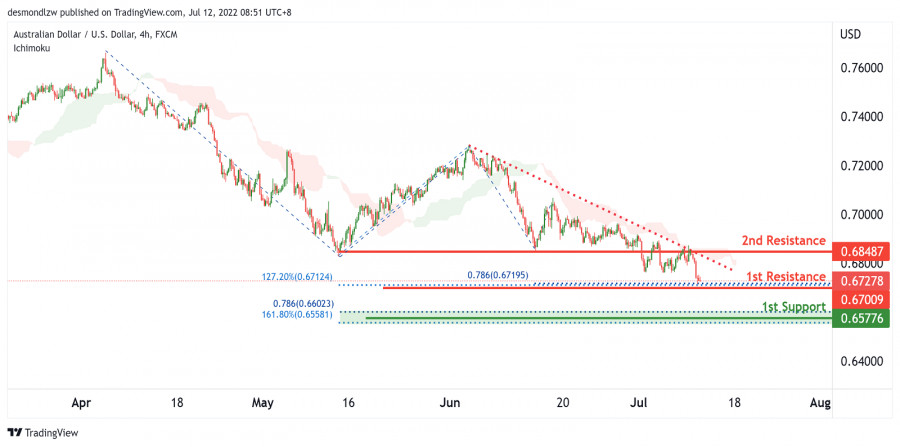 AUD/USD: ожидается дальнейшее развитие нисходящей тенденции. Прогноз на 12 июля 2022 г.ИнстаФорекс - Instaforex, 3 года назад На 4-часовом графике пара AUD/USD торгуется ниже индикатора Облако Ишимоку и вдоль нисходящей линии тренда, что указывает на медвежий импульс. По прогнозам, цена продолжит свое снижение от 1-го уровня сопротивления 0.67009, соответствующего уровню расширения Фибоначчи 127.2% и проекции Фибоначчи 78.6%, до 1-го уровня поддержки 0.65776, который соответствует уровню расширения Фибоначчи 161.8% и проекции Фибоначчи 78.6%. В качестве альтернативы цена может развернуться от 1-го уровня сопротивления и укрепиться до 2-го уровня сопротивления 0.68487, соответствующего уровню свинг-хай. Торговая рекомендация Вход: 0.67009 Условия для входа: 127.2% уровень расширения Фибоначчи и 78.6% проекция Фибоначчи Тейк-профит: 0.65776 Условия для фиксации прибыли: уровень расширения Фибоначчи 161.8% и проекция Фибоначчи 78.6% Стоп-лосс: 0.68487 Условия для активации ордера стоп-лосс: уровень свинг-хай Материал предоставлен компанией InstaForex - www.instaforex.com |