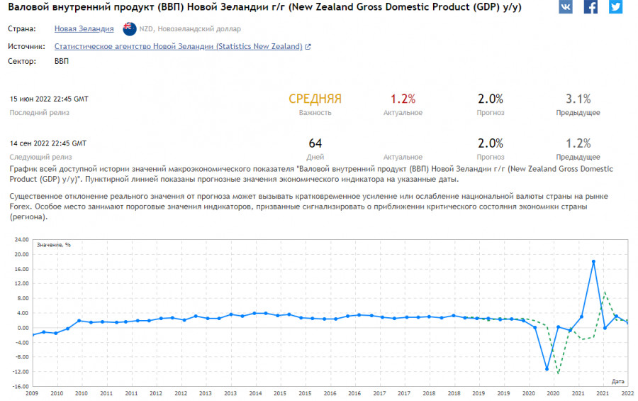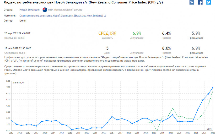 NZD/USD: важнейшие экономические индикаторы Новой Зеландии накануне июльского заседания РБНЗИнстаФорекс - Instaforex, 3 года назад Цены на молочную продукцию падают, отражая общую тенденцию падения цен на сырьевые товары (вопроса цен на энергоносители пока не будем касаться в данном обзоре. Это – отдельная тема). Так, индекс цен на молочную продукцию, подготовленный Global Dairy Trade, отражающий средневзвешенные изменения цен в процентном выражении, вновь снизился в предыдущем отчетном (2-х недельном) периоде. Согласно данным, опубликованным в минувший вторник, он вышел со значением -4,1% (после снижения на -1,3% в предыдущие 2 недели). Вообще, цены на молочные продукты снижаются уже с середины марта. Отчасти это связано с завершившимся 16 марта заседанием ФРС, на котором впервые с июля 2019 года было принято решение повысить процентную ставку. С марта 2020 года и до 16 марта 2022 года процентная ставка ФРС находилась на уровне 0,25%. Весной 2020 года руководители ФРС приняли решение резко понизить процентную ставку, также начав активную программу количественного смягчения с целью поддержки экономики в условиях разворачивавшейся пандемии коронавируса. Экономика же Новой Зеландии во многом еще имеет признаки сырьевой. Причем основная доля новозеландского экспорта приходится на молочную продукцию и пищевые продукты животного происхождения (27%, по данным на 2020 год), мясо и пищевые мясные субпродукты 13,5%), древесину и изделия из нее, древесный уголь 7,52%), а основные покупатели – Китай, Австралия, США, Япония. Соответственно, замедление экономик этих стран ведет к снижению объема ввоза в них новозеландской продукции. Между тем потребительские цены в Новой Зеландии в 1-м квартале подскочили на +6,9% (в годовом выражении), что стало самым сильным ростом за последние 30 лет, и ожидается их очередной рост (на +8,0%) во 2-м квартале (см. также «Инструменты фундаментального анализа»: Инфляционные показатели). Опубликованный ранее индекс потребительских настроений в Новой Зеландии во 2-м квартале 2022 года, согласно данным Westpac, упал с 92,1 до 78,7 пункта против прогноза о росте до 100 пунктов, а дефицит торгового баланса, согласно Бюро статистики Новой Зеландии, в мае вырос до -9,52 млрд долларов с -9,29 млрд в апреле. При этом ВВП страны в 1-м квартале 2022 года снизился до -0,2% (по сравнению с прогнозами рынка в 0,6% и показателем 3,0% в предыдущем квартале). В годовом выражении ВВП снизился до 1,2% против прогноза 3,3% и предыдущего результата 3,1% (см. также «Инструменты фундаментального анализа. Валовый внутренний продукт (ВВП)»). Снижение показателя указывает на ухудшение экономической активности и будет являться сдерживающим для РБ Новой Зеландии фактором при рассмотрении вопроса о дальнейшем повышении процентных ставок (см. также «Инструменты фундаментального анализа: Кредитно-денежная политика центрального банка»). Это негативный фактор для котировок NZD, а, как мы отметили выше, замедление экономики при высокой и ускоряющейся инфляции повышает риски стагфляции в новозеландской экономике. Тем не менее ожидается, что на заседании в среду РБНЗ вновь повысит процентную ставку, а также может высказаться в пользу дальнейшего повышения процентной ставки на следующих заседаниях. Решение по процентной ставке РБНЗ будет опубликовано в среду в 02:00 (GMT), и участникам рынка, следящим за котировками NZD, необ