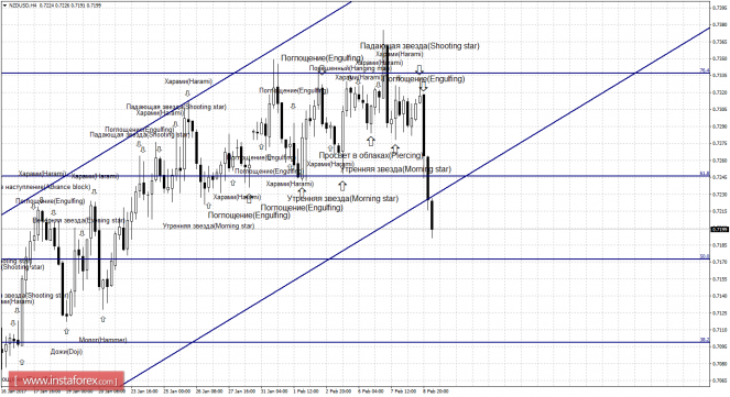 Свечной анализ NZD/USD на 9 февраляИнстаФорекс - Instaforex, 8 лет назад Daily Без образования медвежьей свечной формации пара выполнила разворот в пользу валюты США и начала падение в направлении коррекционного уровня 38,2% - 0,7182. Отбой котировок от уровня Фибо 38,2% позволит рассчитывать на разворот в пользу валюты Новой Зеландии и некоторый рост в направлении уровня коррекции 50,0% - 0,7497. Образование бычьей формации будет являться трендовым сигналом, так как равноудаленный канал имеет направление «вверх» и аналогично сработает в пользу начала роста котировок. Закрепление пары под уровнем Фибо 38,2% повысит шансы на дальнейшее падение в направлении уровня коррекции 23,6% - 0,6789. Сетка Фибо построена по экстремумам от 10 июля 2014 года и 24 августа 2015 года. 4h Сразу две сильные медвежьи формации - «Падающая звезда» и «Поглощение» - сработали на 4-часовом графике в пользу американской валюты. В итоге пара выполнила закрепление под уровнем Фибо 61,8% - 0,7246 и продолжает процесс падения в направлении коррекционного уровня 50,0% - 0,7173. Отбой котировок 9 февраля от уровня Фибо 50,0% позволит ожидать разворот в пользу новозеландской валюты и некоторый рост в направлении уровня коррекции 61,8%. Образование бычьей свечной формации аналогично сработает в пользу начала роста котировок. Закрепление курса пары под уровнем Фибо 50,0% повысит вероятность продолжения падения в направлении коррекционного уровня 38,2% - 0,7099. Сетка Фибо построена по экстремумам от 7 сентября 2016 года и 23 декабря 2016 года. Уточнения: Слабые свечные формации будут отмечаться обычным текстом и размером стрелок. Сильные свечные формации будут отмечаться более жирным текстом и большим размером стрелок. Материал предоставлен компанией InstaForex - www.instaforex.com |