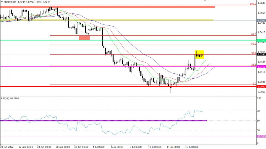 Горящий прогноз по EUR/USD от 20.07.2022ИнстаФорекс - Instaforex, 3 года назад Единая европейская валюта довольно легко превысила отметку в 1,0200 так что локальная коррекция может считаться завершенной. При этом, рынок в принципе проигнорировал данные по инфляции в зоне евро, хотя темпы роста потребительских цен ускорились с 8,1% до 8,6%. Но дело в том, что вчера публиковались итоговые данные, которые лишь подтвердили предварительную оценку. Так что ничего нового в этих данных нет. Инфляция (Европа): Сегодня не публикуется ничего такого, что могло бы как-то серьезно повлиять на рынок. Тем более, что уже завтра состоится заседание правления Европейского Центрального Банка, и инвесторы явно не намерены рисковать. Хотя вопрос с повышением ставки рефинансирования в целом считается закрытым, есть некая неопределенность относительно дальнейших действий европейского регулятора. Очень многое будет зависеть от последующих заявлений Кристин Лагард. И самый важный вопрос - это темпы и масштабы повышения процентных ставок. Они будут определять не только масштабы роста единой европейской валюты прямо в моменте, но и направление движения рынка в среднесрочной перспективе. Итоги завтрашнего заседания определят настроения инвесторов на ближайший год. Так что не удивительно, что рынок сейчас застыл на месте. Инвесторы не намерены рисков без причины. Валютная пара EURUSD в ходе коррекционного движение сумела преодолеть уровень сопротивления 1.0150. Вследствие этого на рынке возник последующий рост объема длинных позиций, что привело к пролонгации действующей коррекции. Менее чем за неделю евро укрепился в стоимости более чем на 300 пунктов. Это сильное ценовое изменение, что вполне может привести к перегреву длинных позиций в краткосрочных периодах. Технический инструмент RSI H4 движется в пределах зоны перепроданности, что как раз указывает на перегрев длинных позиций по евро. RSI D1 в ходе коррекции подошел к средней линии 50. Сигнал о переходе в режим продолговатой коррекции отсутствует. Скользящие линии MA на индикаторах Alligator H4 направлены вверх, что соответствует коррекционному ходу. Alligator D1 игнорирует смену направления во внутридневном периоде. Среднесрочная тенденция по-прежнему нисходящая. Ожидания и перспективы Застой на пике коррекционного хода является процессом накопления торговых сил. В итоге на рынке возникнет новая волна спекуляций, где исходя из точек фиксаций цены относительно застоя будет понятен последующий ход цены. Конкретизируем вышесказанное в торговые сигналы: Позиции на покупку по валютной паре принимаются во внимание после удержания цены выше значения 1.0280 в четырёхчасовом периоде. Позиции на продажу нужно рассматривать после удержания цены ниже 1.0200 в четырёхчасовом периоде. Комплексный индикаторный анализ имеет переменный сигнал в краткосрочном периоде ввиду застоя. Индикаторы во внутридневном периоде сигнализируют о покупке, за счет действующего коррекционного хода. Технические инструменты в среднесрочном периоде сигнализируют о продаже за счет нисходящего тренда. Материал предоставлен компанией InstaForex - www.instaforex.com |