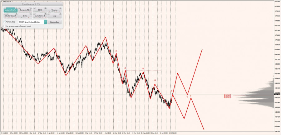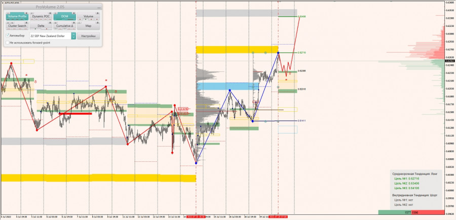 Долгосрочная тенденция: в шорт. Максимальное скопление объемов текущего контракта расположено в диапазоне по котировкам 0.62184-0.62445. В настоящий момент по паре совершаются инвестиционные операции внутри указанного диапазона, указывая на временную неопределенность.