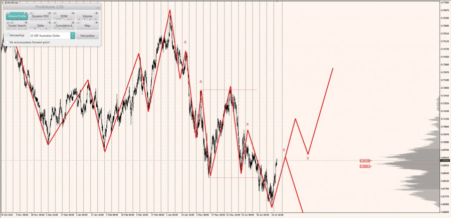 Долгосрочная тенденция: в шорт. Максимальное скопление объемов расположено в диапазоне по котировкам 0.69287-0.69535. В настоящий момент по паре совершаются инвестиционные операции внутри указанного диапазона, указывая на временную неопределенность.