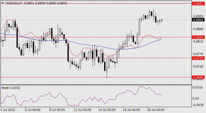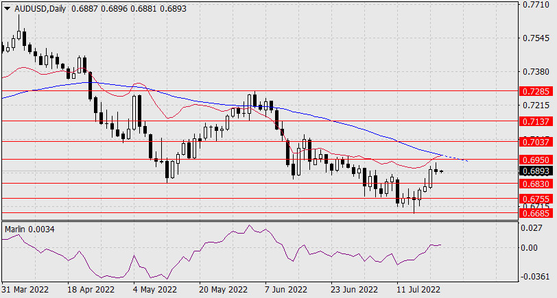 Прогноз по AUD/USD на 21 июля 2022 годаИнстаФорекс - Instaforex, 3 года назад Австралийский доллар на текущий момент находится в нейтральном диапазоне между целевыми уровнями 0.6830 и 0.6950. Соответственно, преодоление ценой поддержки 0.6830 направит цену в среднесрочное понижение с ближайшими целями 0.6755 и 0.6685, а выход над 0.6950, к которому приближается линия Крузенштерна и усиливает его, открывается путь к 0.7037 и далее к 0.7137. Осциллятор Марлин дневного таймфрейма уже закрепился в положительной области, что повышает вероятность хотя бы попытки преодолеть сопротивление 0.6950. Попытка может потерпеть крах, и тогда наблюдаемый выход осциллятора в зону роста окажется ложным, а цена вернётся к 0.6830. Очевидно, австралийский доллар наблюдает за сегодняшним европейским рынком, так как ЕЦБ объявит решение по монетарной политике.