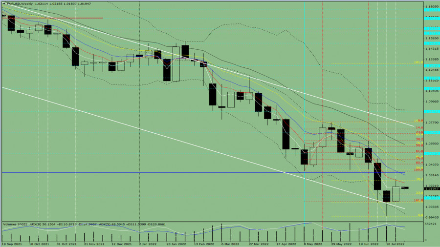 Технический анализ на неделю, с 25 по 30 июля, по валютной паре EUR/USDИнстаФорекс - Instaforex, 3 года назад Трендовый анализ (рис. 1). На этой неделе рынок от уровня 1.0213 (закрытие последней недельной свечи) начнёт движение вверх с целью достижения откатного уровня 38.2% – 1.0213 (жёлтая пунктирная линия). От этого уровня рынок попробует продолжить движение вверх с целью тестирования откатного уровня 50.0%, 1.0367 (жёлтая пунктирная линия). При тестировании этого уровня цена может начать движение вниз со следующей целью 1.0278 – верхний фрактал (недельная свеча от 17.07.2022 года). Рис. 1 (недельный график). Комплексный анализ: - индикаторный анализ – вверх; Вывод по комплексному анализу: восходящее движение. Общий итог расчёта свечи валютной пары EUR/USD по недельному графику: цена на неделе, вероятней всего, будет иметь восходящую тенденцию с отсутствием первой нижней тени у недельной белой свечи (понедельник – вверх) и отсутствием второй верхней тени (пятница – вверх). На этой неделе рынок от уровня 1.0213 (закрытие последней недельной свечи) начнёт движение вверх с целью достижения откатного уровня 38.2% – 1.0213 (жёлтая пунктирная линия). От этого уровня рынок попробует продолжить движение вверх с целью тестирования откатного уровня 50.0%, 1.0367 (жёлтая пунктирная линия). При тестировании этого уровня цена может начать движение вниз со следующей целью 1.0278 – верхний фрактал (недельная свеча от 17.07.2022 года). Альтернативный сценарий: от уровня 1.0213 (закрытие последней недельной свечи) начнёт движение вниз с целью достижения целевого уровня 161.8% – 1.0078 (красная пунктирная линия). При тестировании этого уровня цена попробует начать движение вверх с цель тестирования откатного уровня 23.6% – 1.0146 (жёлтая пунктирная линия). Материал предоставлен компанией InstaForex - www.instaforex.com |