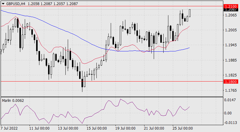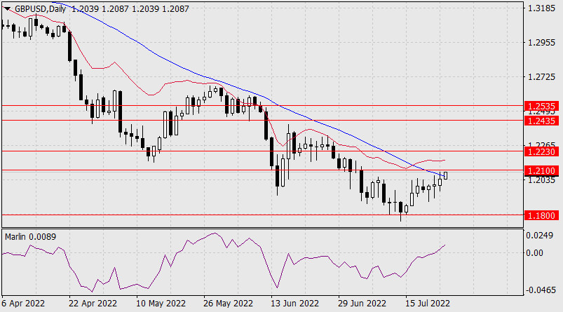 Прогноз по GBP/USD на 26 июля 2022 годаИнстаФорекс - Instaforex, 3 года назад Британский фунт в понедельник сделал первую попытку выхода над индикаторную линию Крузенштерна дневного масштаба. Сегодня утром фунт более уверенно выходит над это сопротивление, приблизившись к целевому уровню 1.2100. Преодоление уровня открывает цель 1.2230. Закрепление над 1.2230 может продлить рост цены до уровня 1.2435.