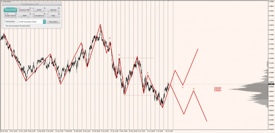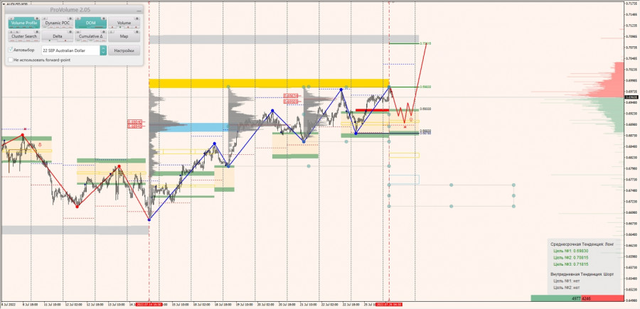 Долгосрочная тенденция: в шорт. Максимальное скопление объемов расположено в диапазоне по котировкам 0.68881-0.69158. В настоящий момент по паре совершаются инвестиционные операции выше, указывая на слабость продавцов.