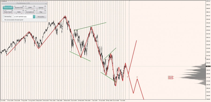 Долгосрочная тенденция: в лонг. Максимальное скопление объемов текущего контракта расположено в диапазоне по котировкам 3760.02-3791.00. В настоящий момент по SNP500 совершаются инвестиционные операции выше, указывая на силу покупателей.