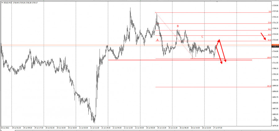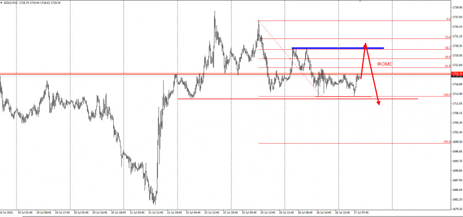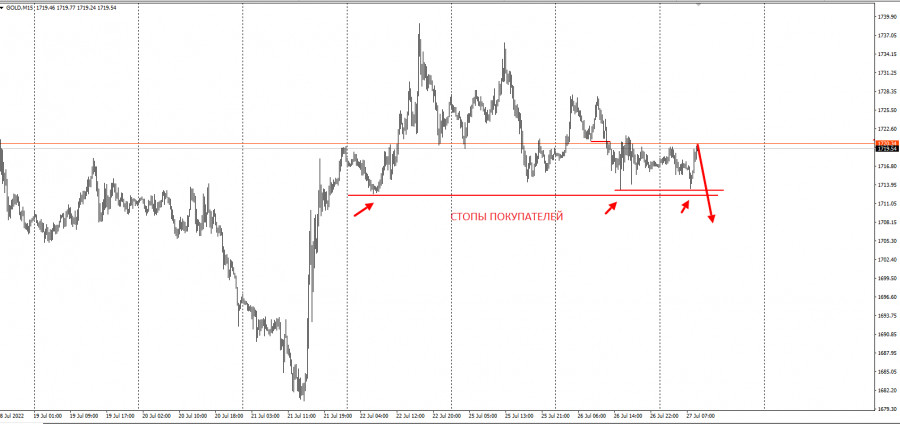 Торговая идея по золоту. Ловушка покупателейИнстаФорекс - Instaforex, 3 года назад Добрый день, уважаемые трейдеры! Представляю вашему вниманию торговую идею по золоту. Итак, после невероятного роста золотых котировок 21-22 июля инструмент вошёл в консолидацию с очень четкой нижней границей на уровне 1712. Соответственно, все покупатели за последние 4 дня будут вынуждены ограничивать свои риски именно за этот уровень. В рамках системы "охота за стопами" предлагаем рассмотреть шортовый сценарий на понижение инструмента по следующей схеме: п Фактически имеем трёхволновую структуру "АВС", где волной А выступает шортовая инициатива от 25 июля. Сегодня в 21-00 ставка по доллару и пресс-конференция ФОМС. Если до этого времени 1712 не будет пробит, можно посмотреть такой сценарий: