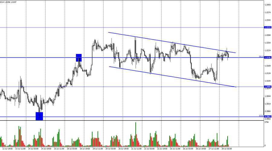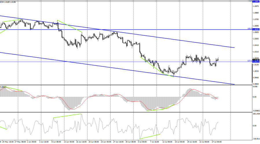 EUR/USD. 28 июля. Итоги заседания ФРС «ястребиные», но доллар все равно упал.ИнстаФорекс - Instaforex, 3 года назад Добрый день, уважаемые трейдеры! Пара EUR/USD в среду выполнила рост к верхней линии нисходящего трендового коридора и выполнить закрепление над ним не сумела. Таким образом, отбой от этой линии сработает в пользу американской валюты и возобновления падения котировок в направлении уровня 1,0080. Если все же закрепление произойдет, шансы на дальнейший рост европейской валюты в направлении уровня 1,0315 резко увеличатся. Вчера вечером состоялось событие, которого долго ждали многие трейдеры. ФРС огласила результаты двухдневного заседания и выяснилось, что процентная ставка была поднята до 2,5% на 0,75%. Таким образом, мы стали свидетелями нового ужесточения денежно-кредитной политики. И тем не менее американская валюта показала падение на 100 пунктов после того, как стали известны результаты. Почему так произошло, если результаты являются «ястребиными»? С моей точки зрения, это в некотором роде нонсенс. Напомню, что на рынке присутствует большое количество трейдеров и сам по себе информационный фон не обязан вызывать то или иное движение. Вызывает движение пары реакция трейдеров на событие. А трейдеры имеют полное право реагировать как захотят. Допустим большинство трейдеров не видят дальнейшего падения европейской валюты и не хотят больше от нее избавляться. Тогда ФРС может повысить ставку хоть на 5%, доллар не вырастет. Безусловно, это объяснение немного утрированное, но его суть заключается в том, что на любое событие может быть абсолютно любая реакция трейдеров. В большинстве случаев она совпадает с характером самого события, но иногда – нет. Трейдеры были уже давно морально готовы к повышению ставки на 0,75%, поэтому для них это не стало неожиданностью. И мы в итоге получили ситуацию, когда ФРС поднимает ставку рекордными темпами за последние 40 лет, а доллар при этом падает. Но хочу напомнить, что доллар упал всего-то на 100 пунктов, нисходящий трендовый канал сохраняется, а в долгосрочном плане американская валюта растет уже больше года. Поэтому я считаю, что ничего страшного вчера вечером не произошло. На 4-часовом графике пара выполнила разворот в пользу евровалюта и закрепление над уровнем 127,2% - 1,0173. Таким образом, процесс роста может быть продолжен в направлении верхней линии нисходящего трендового коридора, но я считаю, что более важным сейчас является нисходящий коридор на часовом графике, от верхней линии которого пара может выполнить отбой уже в ближайшие часы. В этом случае падение котировок может быть возобновлено. Отчет Commitments of Traders (COT):
