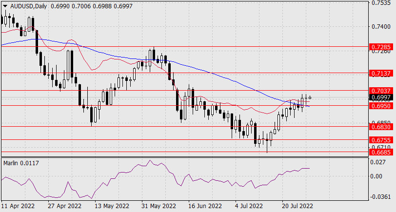 Прогноз по AUD/USD на 29 июля 2022 годаИнстаФорекс - Instaforex, 3 года назад Австралийский доллар вчера закрепился над индикаторными линиями баланса и Крузенштерна на графике дневного масштаба. Осциллятор Марлин на текущий момент формирует горизонтальную линию, но даже если намечается разворот, то цена сумеет дойти до первого целевого уровня 0.7037 (минимум 25 мая). А если цена закрепится над 0.7037, то рост продолжится до следующего целевого уровня 0.7137. Растущий потенциал у австралийского доллара имеется. Цены на сырьё с утра растут и поддерживают австралийскую валюту; нефть (WTI) 0,83%, серебро 0,77%, вчера медь подорожала на 1,39%, железная руда на 3,24%. |