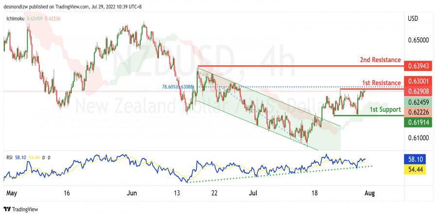 NZD/USD: сохраняется потенциал для дальнейшего роста. Прогноз на 29 июля 2022ИнстаФорекс - Instaforex, 3 года назад На 4-часовом графике пара NZD/USD пробила нисходящий канал и сейчас движется вдоль восходящей линии тренда согласно индикатору RSI, а также выше Облака Ишимоку, что указывает на бычий импульс. Ожидается, что цена вырастет от 1-го уровня сопротивления 0.63001, соответствующего уровню свинг-хай и 78.6% уровню коррекции Фибоначчи, ко 2-му уровню сопротивления 0.63943, который соответствует уровню свинг-хай. В качестве альтернативы цена может развернуться от 1-го уровня сопротивления и упасть к 1-му уровню поддержки 0.61914, соответствующему нескольким уровням свинг-лоу. Торговая рекомендация Вход: 0.63001 Условия для входа: уровень свинг-хай, соответствующий 78.6% уровню коррекции Фибоначчи Тейк-профит: 0.63943 Условия для фиксации прибыли: уровень свинг-хай Стоп-лосс: 0.61914 Условия для активации ордера стоп-лосс: несколько уровней свинг-лоу Материал предоставлен компанией InstaForex - www.instaforex.com |