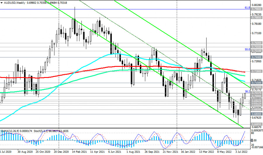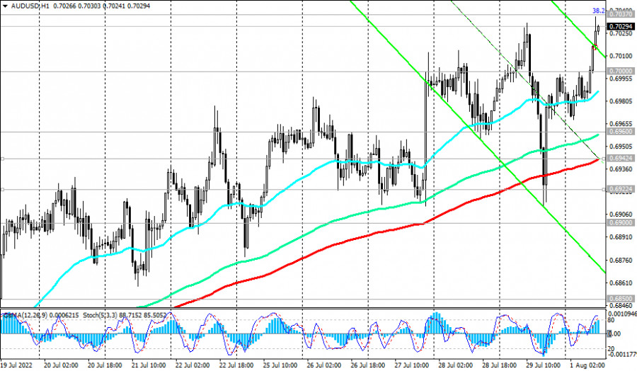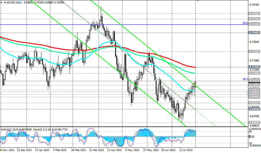 AUD/USD: технический анализ и торговые рекомендации на 01.08.2022ИнстаФорекс - Instaforex, 3 года назад Как мы отметили в нашем сегодняшнем «Фундаментальном анализе», «доллар продолжает снижаться в начале новой недели», во многом определяя динамику основных долларовых «мажорных» валютных пар. То же самое можно сказать и про динамику AUD/USD. Эта валютная пара растёт, «развивая восходящую динамику выше важных краткосрочных уровней поддержки 0.6942 (ЕМА200 на 1-часовом графике), 0.6922 (ЕМА200 на 4-часовом графике)». Технические индикаторы OsMA и Стохастик на дневном и недельном графиках также находятся на стороне покупателей. Целями этой восходящей пока коррекции становятся ключевые уровни сопротивления 0.7100 (ЕМА144 на дневном графике), 0.7150 (ЕМА200 на дневном графике). Ниже этих уровней сопротивления AUD/USD все еще находится в зоне медвежьего рынка. Лишь пробой долгосрочного уровня сопротивления 0.7280 (ЕМА200 на недельном графике) выведет пару в зону долгосрочного бычьего рынка. Между уровнями сопротивления 0.7100, 0.7150 также проходит верхняя граница нисходящего канала на недельном графике. Поэтому в этой зоне высока вероятность отбоя и возобновления нисходящей динамки AUD/USD. Более ранний сигнал на возобновление коротких позиций поступит уже после возврата цены внутрь нисходящего канала на дневном графике, верхняя граница которого проходит через отметку 0.7000. Подтверждающим сигналом станет последовательный пробой уровней поддержки 0.6960 (ЕМА50 на дневном графике), 0.6942, 0.6922. Если активируется этот сценарий, то после пробоя уровня поддержки 0.6900 целями снижения станут локальные уровни поддержки 0.6850, 0.6800, 0.6700, 0.6685 (минимум июля и этого года). Вероятно, завтра участники рынка точнее определятся с направлением торговли по AUD/USD, когда в 04:30 (GMT) будет опубликовано решение РБА по процентной ставке (подробнее см. в «Важнейшие экономические события недели 01.08.2022 – 07.08.2022»). *) об особенностях торговли парой AUD/USD см. в статье AUD/USD: валютная пара (характеристики, рекомендации) Уровни поддержки: 0.7000, 0.6960, 0.6942, 0.6922, 0.6900, 0.6850, 0.6800, 0.6700, 0.6685, 0.6660, 0.6500, 0.6455, 0.6270, 0.5975, 0.5665, 0.5510 Уровни сопротивления: 0.7037, 0.7100, 0.7150, 0.7200, 0.7280