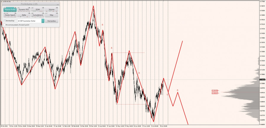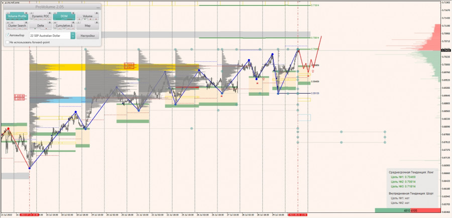 Среднесрочная тенденция: в лонг. Максимальное скопление объемов среднесрочной тенденции расположено в диапазоне по котировкам 0.68945-0.69040 и 0.69912-0.70004. В настоящий момент по паре совершаются инвестиционные операции выше, указывая на силу покупателей.