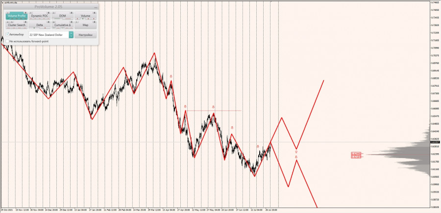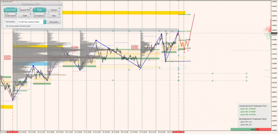 Долгосрочная тенденция: в шорт. Максимальное скопление объемов текущего контракта расположено в диапазоне по котировкам 0.62184-0.62445. В настоящий момент по паре совершаются инвестиционные операции выше, указывая на слабость продавцов.
