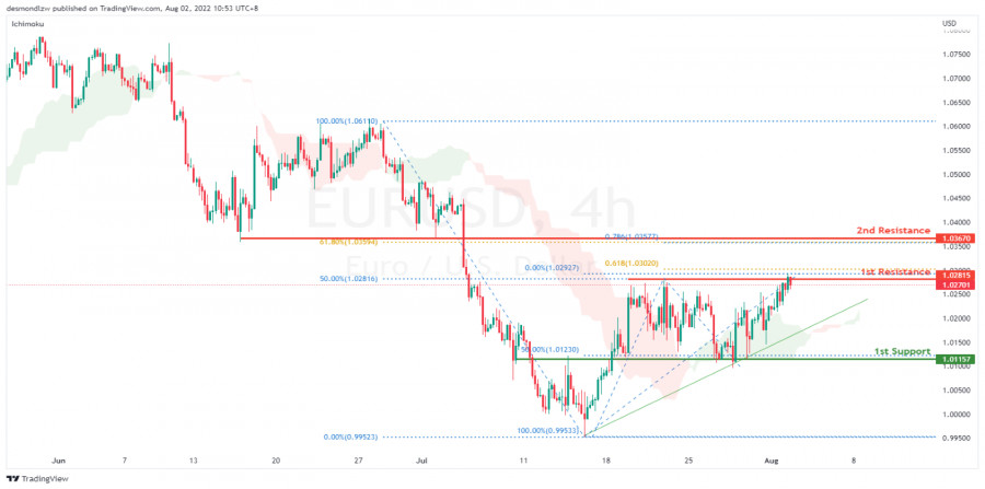 EUR/USD: сохраняется потенциал для дальнейшего роста. Прогноз на 2 августа 2022ИнстаФорекс - Instaforex, 3 года назад На 4-часовом графике пара EUR/USD завершила свой медвежий тренд и начала двигаться в восходящем направлении. Сейчас цена тестирует сопротивление на уровне 1.028, соответствующем 50% уровню коррекции Фибоначчи. Если цена продолжит торговаться в восходящем направлении, она направится ко 2-му уровню сопротивления 103.6, который также является ключевым уровнем свинг-лоу и 61.8% уровню коррекции Фибоначчи. В качестве альтернативы цена может отскочить от уровня сопротивления и протестировать 1-й уровень поддержки 1.011. Торговая рекомендация Вход: 1.208 Условия для входа: бычье направление Тейк-профит: 1.036 Условия для фиксации прибыли: уровень коррекции Фибоначчи 61.8% Стоп-лосс: 1.01 Условия для активации ордера стоп-лосс: уровень свинг-лоу, промежуточный уровень поддержки Материал предоставлен компанией InstaForex - www.instaforex.com |