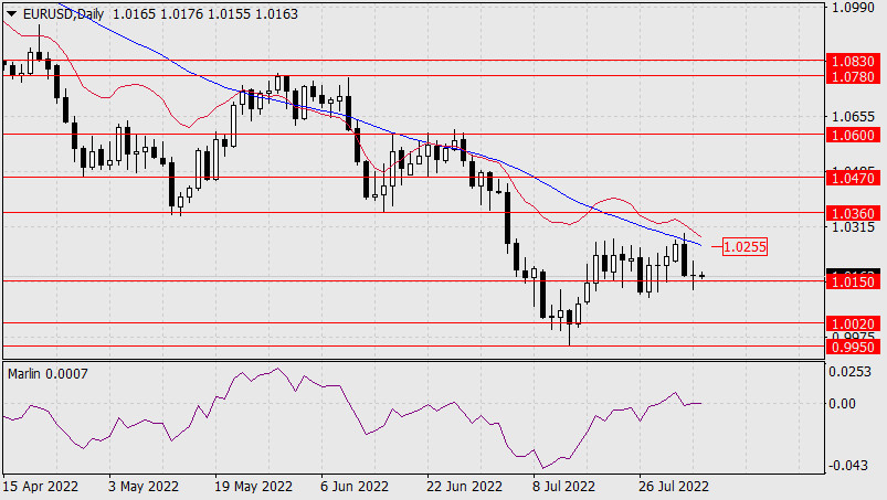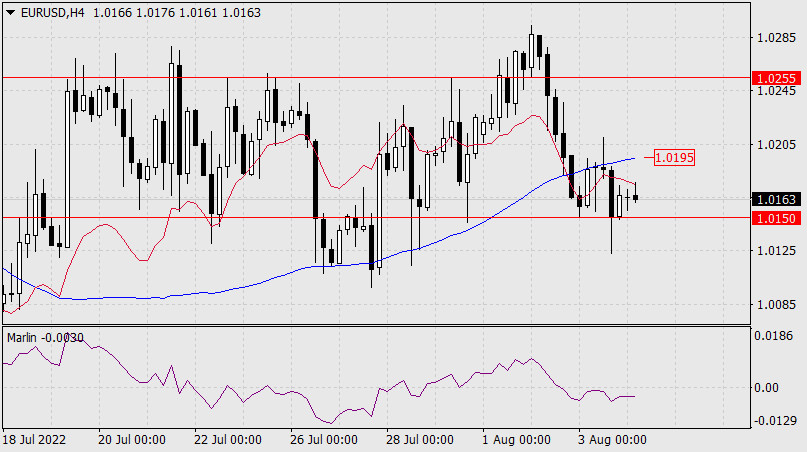 Прогноз по EUR/USD на 4 августа 2022 годаИнстаФорекс - Instaforex, 3 года назад В среду евро проторговался с амплитудой в 45 пунктов, закрыв день на уровне открытия, выше поддержки 1.0150. Сигнальная линия осциллятора Марлин также не смогла перейти через нулевую линию на территорию «медведей». Таким образом, ценовой уровень 1.0150 предстаёт достаточно сильным, цена может развить ускорение при его преодолении. Цели снижения: 1.0020, 0.9950.