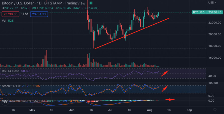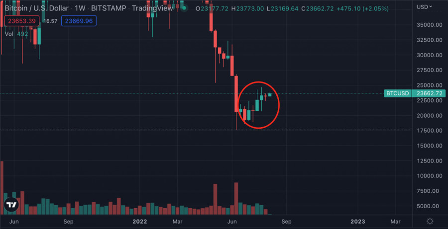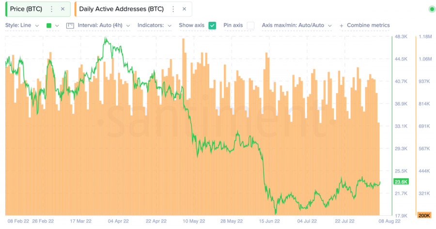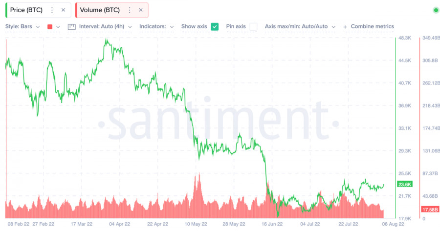 Биткоин закрывает недельную свечу выше $23k: чего ожидать от криптовалюты?ИнстаФорекс - Instaforex, 3 года назад Биткоин продолжает убеждать рынок в полноценном начале восстановительного сезона, и закрывает очередную торговую неделю на бычьей ноте, выше $23k. Всего за последние 8 недель криптовалюте удалось 5 раз закрыть недельные торги зеленой свечой. Динамика очевидна и заключается в постепенном развороте тренда. Помимо восходящего движения цены это также видно по основным метрикам, которые отражают настроения инвесторов. Индекс страха и жадности, который находился ниже отметки 10 рекордное количество времени, совершил восходящий рывок и достиг уровня 30. С учетом ситуации, в которой оказался рынок в июне, это существенный рывок, указывающий на растущий интерес к Биткоину. Это подтверждается числом уникальных адресов в сети криптовалюты, которое на прошлой неделе достигало отметки миллион. На выходных показатель ожидаемо просел до уровня 600 тысяч, однако с учетом того, что еще месяц назад такое число адресов было пиковым, показатель находится на высоком уровне. При этом наблюдается сохранение тенденции по снижению объемов суточных торгов Биткоина. На выходных метрика обвалилась до уровня в $17 миллиардов, что является низким показателем даже с учетом выходных. Это нездоровая тенденция, указывающая на рост активности адресов, которые не способны обеспечить высокий уровень торговой активности. В результате складывается ситуация, при которой мы наблюдаем существенный прирост числа уникальных адресов, и нисходящую динамику объемов торгов BTC. Такая дивергенция может означать проблемы в фундаменте восходящего тренда, который образовался на графике Биткоина. На дневном графике криптовалюты мы видим, что BTC вновь ненадолго стал стейблкоином, который двигается вблизи уровня $23k. Актив продолжает сохранять структуру восходящего тренда от 19 июня, что позволяет предположить формирование локального дна на отметке $17k. Также важно отметить, что криптовалюта вышла из диапазона колебаний $19k-$22k, и успешно закрепилась выше $22,6k, где проходит ключевая зона поддержки нового диапазона $22,6k-$24k. И несмотря на успешное закрепление актива выше $23k, Bitcoin не демонстрирует перспектив для восходящего тренда. На дневном графике криптовалюты видны предпосылки к восходящему движению. Индекс RSI продолжает восходящее движение к уровню 60, что является позитивным сигналом, указывающим на рост активно покупателей. Стохастический осциллятор также сформировал бычье пересечение и продолжает двигаться выше отметки 60. Однако важно сделать скидку на постепенное восстановление торговой активности после выходных, и не придавать большого значения текущим восходящим сигналам на графиках. Как мы уже отмечали, торговые объемы продолжают снижаться и достигают локальных минимумов. При такой ситуации надеяться на восходящее движение не стоит, а на восстановление торговой активности в преддверии рабочей недели вполне. 10 августа также станет важным фактором, который тормозит формирование восходящих импульсов. Десятого августа в США озвучат результаты по Индексу потребительских цен (ИПЦ) за июль. Прогнозисты верят в показатель на уровне 8,7%. Соответственно, можно предположить, что в текущей цене BTC уже заложена эта цифра. Криптовалюта будет двигаться в зависимости от р