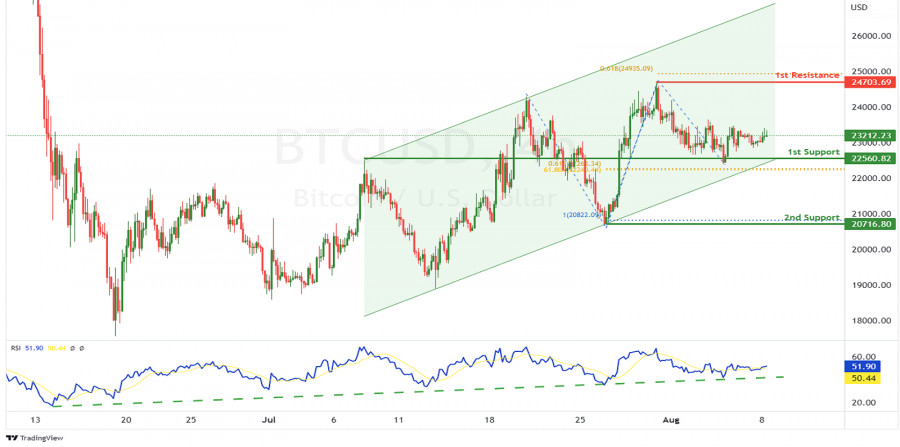 BTC/USD: ожидается усиление бычьего импульса. Прогноз на 8 августа 2022ИнстаФорекс - Instaforex, 3 года назад На 4-часовом графике пара BTC/USD торгуется в рамках бычьего канала, а индикатор RSI движется вдоль восходящей линии тренда, что указывает на бычий импульс. Ожидается, что цена вырастет от 1-го уровня поддержки 22560.82, соответствующего линии поддержки, 61.8% уровню коррекции Фибоначчи и 61.8% проекции Фибоначчи, до 1-го уровня сопротивления 24703.69, который соответствует уровню свинг-хай, выступающему в качестве сопротивления, и 61.8% проекции Фибоначчи. В качестве альтернативы цена может пробить 1-й уровень поддержки и упасть до 2-го уровня поддержки 20716.80, соответствующего уровню свинг-лоу, выступающему в качестве поддержки, и 100% проекции Фибоначчи. Торговая рекомендация Вход: 22560.82 Условия для входа: линия поддержки, уровень коррекции Фибоначчи 61.8% и проекция Фибоначчи 61.8% Тейк-профит: 24703.69 Условия для фиксации прибыли: уровень свинг-хай, выступающий в качестве сопротивления, и проекция Фибоначчи 61.8% Стоп-лосс: 20716.80 Условия для активации ордера стоп-лосс: уровень свинг-лоу, выступающий в качестве поддержки, и 100% проекция Фибоначчи Материал предоставлен компанией InstaForex - www.instaforex.com |