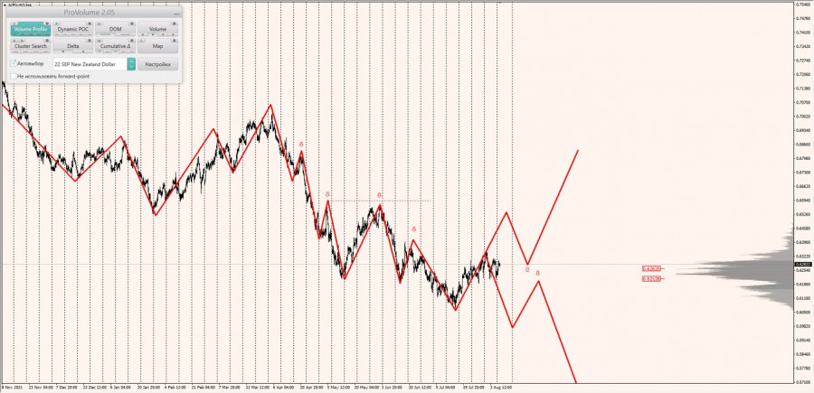 Долгосрочная тенденция: в шорт. Максимальное скопление объемов текущего контракта расположено в диапазоне по котировкам 0.62126-0.62620. В настоящий момент по паре совершаются инвестиционные операции внутри указанного диапазона, указывая на временную неопределенность.