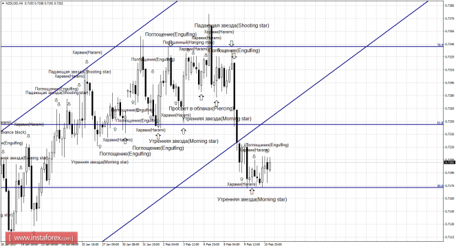 Свечной анализ NZD/USD на 13 февраляИнстаФорекс - Instaforex, 8 лет назад Daily Без образования медвежьей свечной формации котировки пары NZD/USD выполнили разворот в пользу американского доллара и возврат к уровню Фибо 38,2% - 0,7182. Отбой курса пары от уровня коррекции 38,2% позволит рассчитывать на разворот в пользу валюты Новой Зеландии и некоторый рост в направлении коррекционного уровня 50,0% - 0,7497. Образование бычьей свечной формации будет являться трендовым сигналом, исходя из направления равноудаленного канала, и повысит вероятность отбоя от уровня Фибо 38,2%. Закрепление котировок под уровнем коррекции 38,2% повысит шансы на дальнейшее падение в направлении следующего уровня Фибо 23,6% - 0,6789. Сетка Фибо построена по экстремумам от 10 июля 2014 года и 24 августа 2015 года. 4h Две новые медвежьи формации «Харами» и «Поглощение» не позволили паре продолжить начатый рост котировок. Был выполнен разворот в пользу валюты США, а котировки могут выполнить возврат к коррекционному уровню 50,0% - 0,7172. Образование 13 февраля бычьей формации позволит рассчитывать а разворот в пользу валюты новозеландской валюты и продолжение роста в направлении уровня коррекции 61,8% - 0,7246. Равноудаленный канал сейчас никакой роли не играет, котировки пары ушли ниже него. Закрепление курса пары под уровнем Фибо 50,0% сработает в пользу продолжения падения в направлении следующего уровня коррекции 38,2% - 0,7099. Сетка Фибо построена по экстремумам от 7 сентября 2016 года и 23 декабря 2016 года. Уточнения: Слабые свечные формации будут отмечаться обычным текстом и размером стрелок. Сильные свечные формации будут отмечаться более жирным текстом и большим размером стрелок. Материал предоставлен компанией InstaForex - www.instaforex.com |