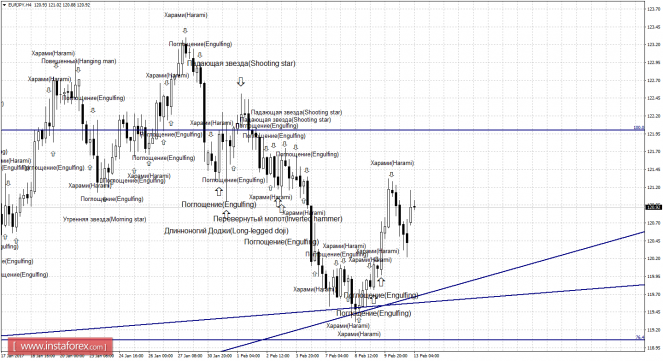 Свечной анализ EUR/JPY на 13 февраляИнстаФорекс - Instaforex, 8 лет назад Daily Без образования бычьей формации котировки выполнили разворот в пользу валюты ЕС и продолжают процесс роста в направлении коррекционного уровня 38,2% - 124,93. Образование медвежьей свечной формации позволит трейдерам рассчитывать на разворот в пользу японской иены и некоторое падение в направлении уровня коррекции 23,6% - 119,05. Медвежья формация будет трактоваться как коррекционная, так как равноудаленный канал имеет направление «вверх». Закрепление котировок под уровнем Фибо 23,6% повысит шансы пары на дальнейшее падение в направлении следующего уровня коррекции 0,0% - 109,58. Сетка Фибо построена по экстремумам от 8 декабря 2014 года и 24 июня 2016 года. 4h Медвежья свечная формация «Харами», образовавшаяся на 4-часовом графике и априори не являющаяся сильной, позволила котировкам выполнить разворот в пользу валюты Японии и начать процесс падения в направлении уровня коррекции 76,4% - 119,06. Образование бычьей свечной формации 13 февраля позволит ожидать разворот в пользу европейской валюты и некоторый рост котировок в направлении уровня Фибо 100,0% - 122,00. Равноудаленный канал имеет направление «вверх», таким образом, любая бычья формация – трендовая. Закрепление курса пары над уровнем коррекции 100,0% повысит шансы на продолжение роста в направлении следующего коррекционного уровня 161,8% - 129,70. Сетка Фибо построена по экстремумам от 24 июня 2016 года и 24 июня 2016 года. Уточнения: Слабые свечные формации будут отмечаться обычным текстом и размером стрелок. Сильные свечные формации будут отмечаться более жирным текстом и большим размером стрелок. Материал предоставлен компанией InstaForex - www.instaforex.com |